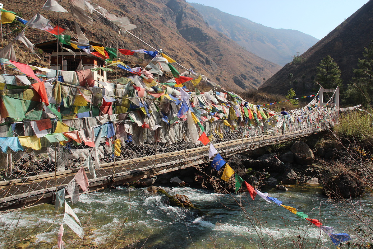 Our first stop was at Tamchog Lhakhang, a 14th century temple that is apparently still occupied by the spirit of its founder, the great master architect Thangtong Gyalpo. He built a suspension bridge that still spans the Paro River, although officials have had to protect the bridge from people who had started souveniring some of the auspicious 14th century ironwork to make earrings and other items of jewellery. A small cave above the bridge is said to be the remains of Thangtong’s iron mine that he used to build the bridge. Like many Bhutanese bridges, this one is bedecked with prayer flags that flutter in the strong breezes that blow along the river valleys.