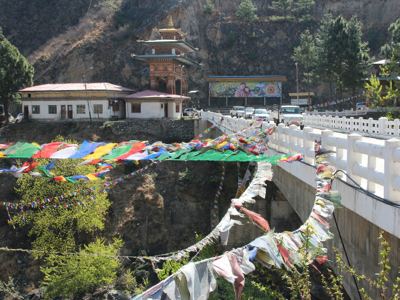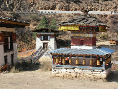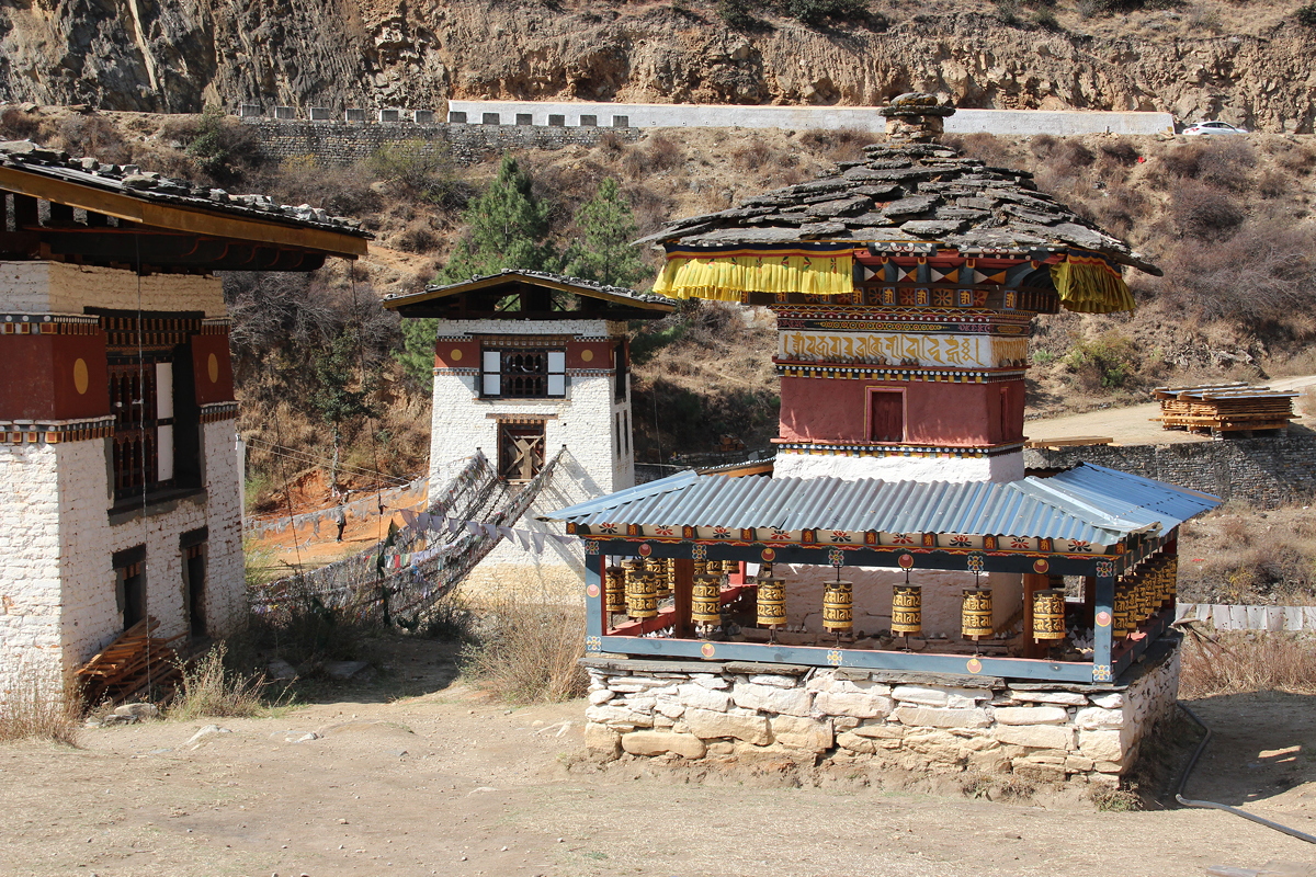 At a little after 1pm, we reached the small village of Sopsokha. The stupa built in the middle of the road told us in no uncertain terms that spiritual matters take priority over road safety in this part of Bhutan, despite the wonderful road signs we had been passing all the way with messages such as “After drinking whiskey, driving is risky”, “If you are married, divorce speed”, “Darling I like you, but not so fast”, “Safety on road is ‘safe tea’ at home” and “Be gentle on my curves”.