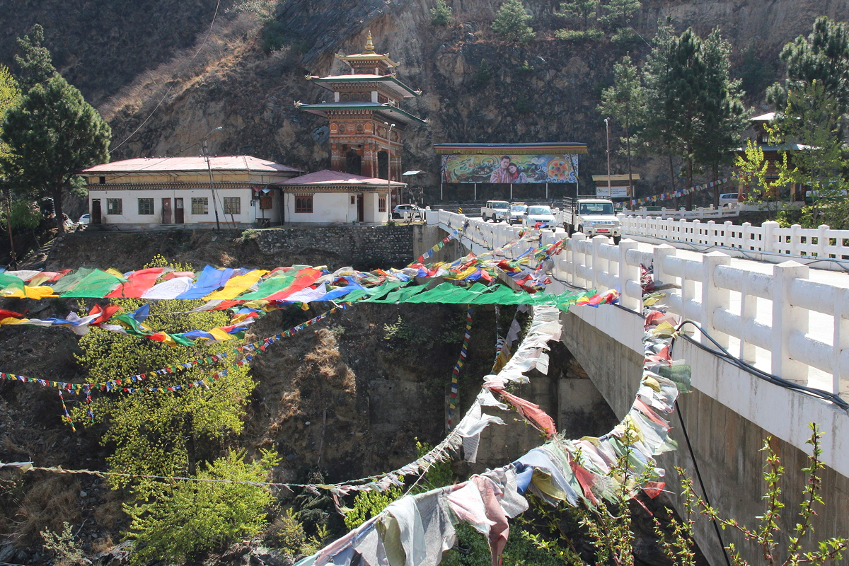 Our second stop was a brief one at Chunzom, which is the point marking the confluence of two rivers (the Paro Chhu and the Wang Chuu) and the intersection of four main roads. In traditional Bhutanese culture, the meeting of two rivers is considered to be inauspicious, so to overcome this problem, three chortens (stupas) and a large prayer wheel have been built to ward off evil spirits. Each chorten is in a different style – Bhutanese, Nepali and Tibetan.
