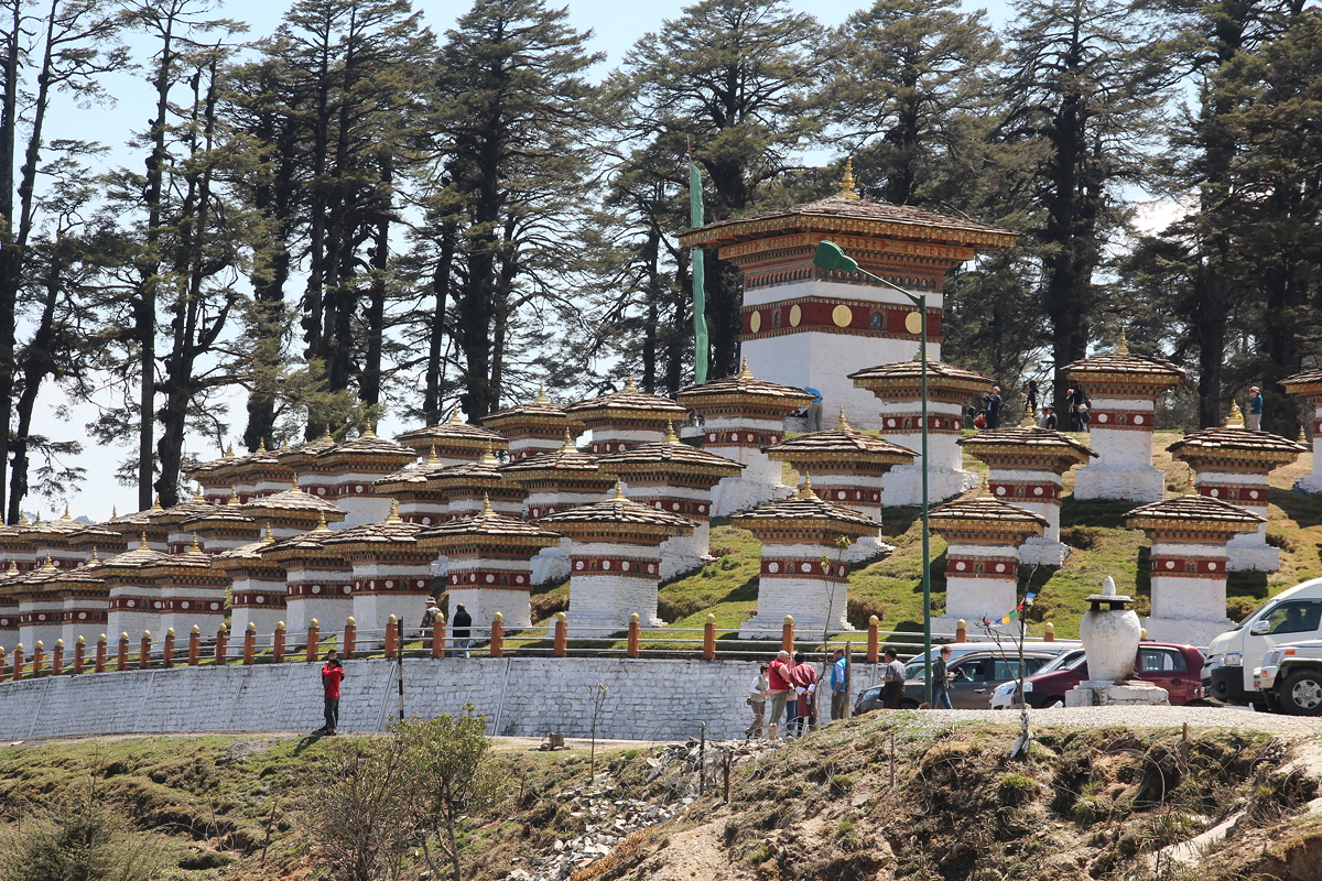 Our drive took us around the outskirts of Thimphu, Bhutan’s capital city, after which the road started climbing through thick pine forests before reaching the highest point of out drive, Dochula. This mountain pass was marked by an impressive array of 108 chortens built in 2004 to honour the deaths of Bhutanese soldiers who put down an armed rebellion of Assamese militants in southern Bhutan who were campaigning for separation from Bhutan in December 2003. More specifically, the chortens were built by the Queen Mother, Ashi Dorji Wangmo Wangchuk, for the safety and security of the 4th King of Bhutan, Jigme Singye Wangchuck.
