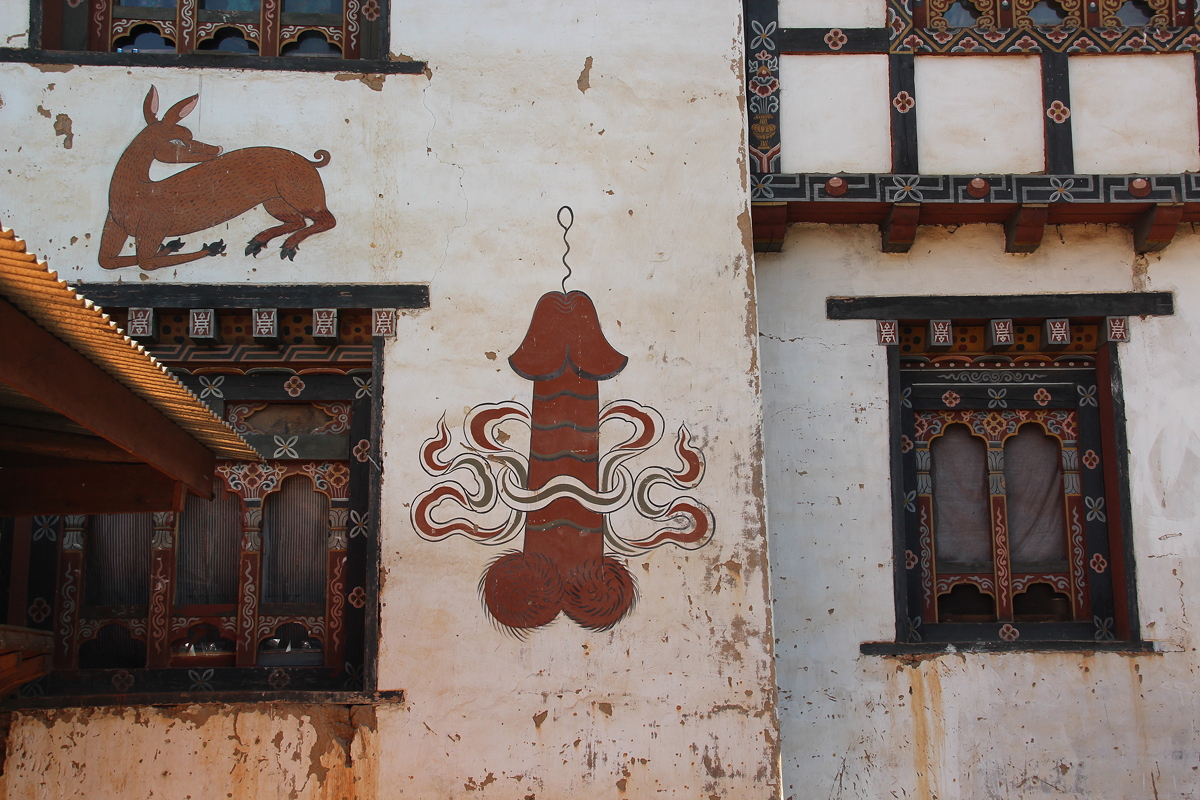 Set on a hill overlooking the nearby river, Chimi Lakhang is also known as the Divine Madman’s Monastery after Lama Drukpa Kunley, whose cousin founded the monastery in 1499. Originally from Tibet, Drukpa Kunley was known for his weird songs, lurid humour and widespread, obscene, sexual practices and immorality to dramatise Buddha’s teachings to the ordinary population. He was clearly not a fan of one of Buddha’s teachings, that of moderation and following the Middle Way, but as it was explained to me today when I asked about this apparent paradox, “Buddhism is a very inclusive religion”.
