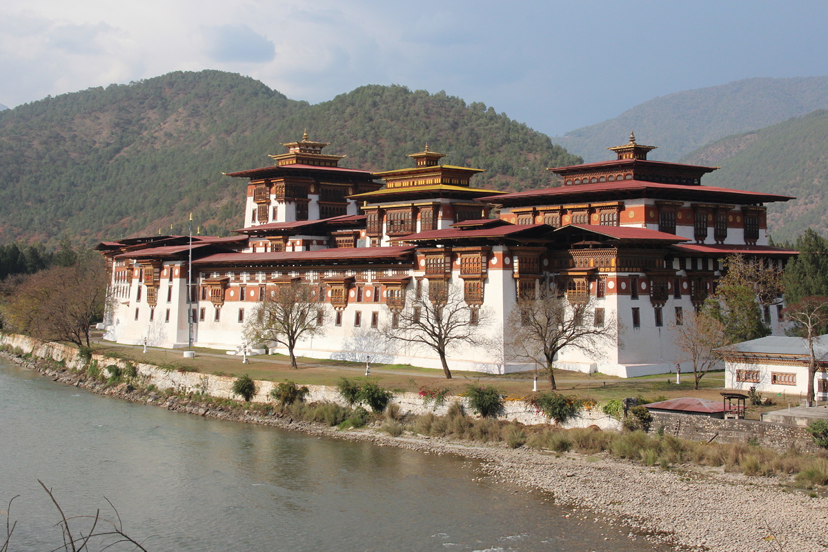 The dzong’s reputation for architectural quality is well deserved. The huge whitewashed walls rise above the surrounding river plain as a towering fortress that is 180 metres long and 72 metres wide, topped with a gold dome, and decorated with the finest quality of carved woodwork imaginable.