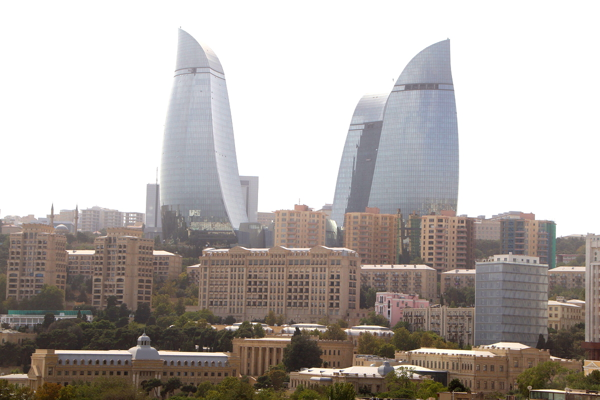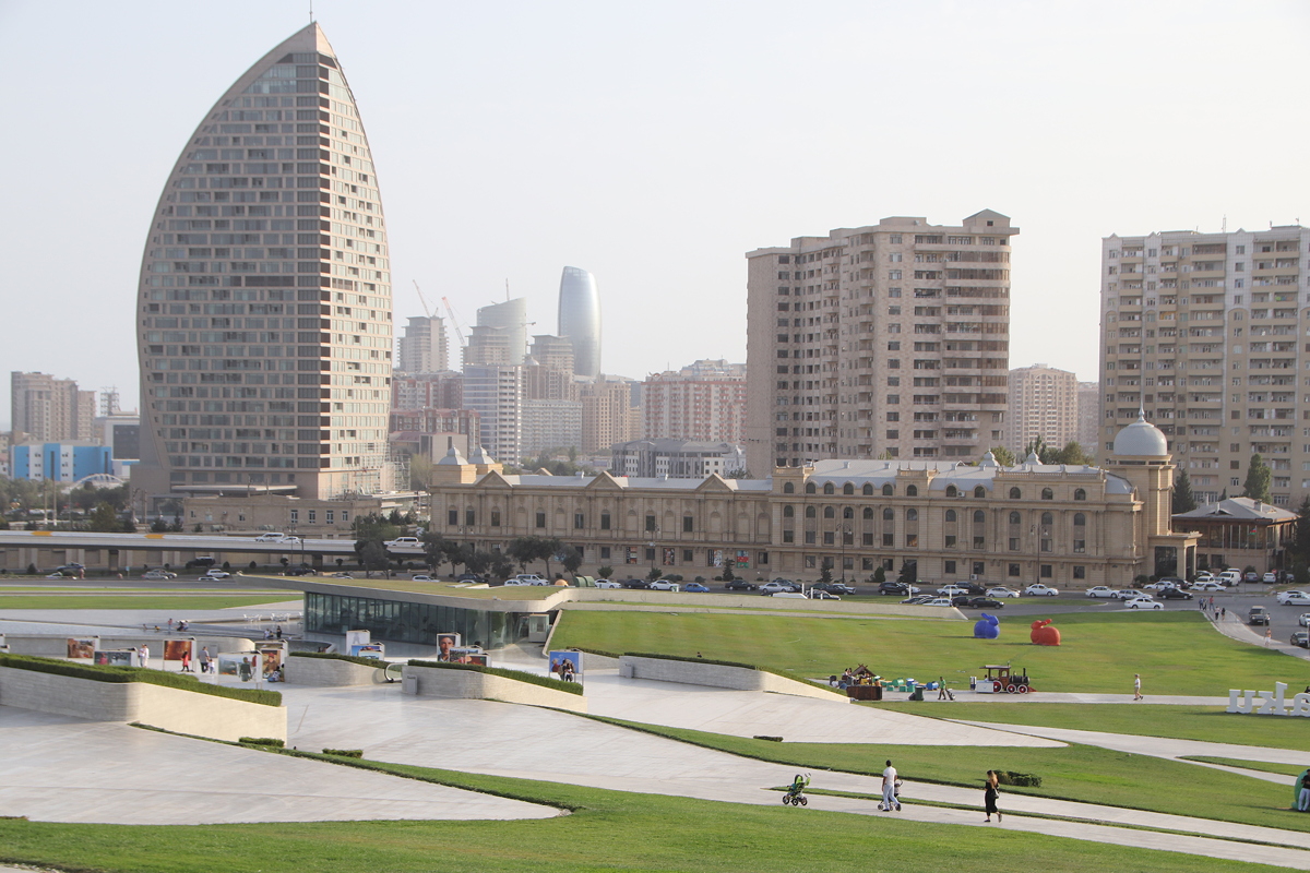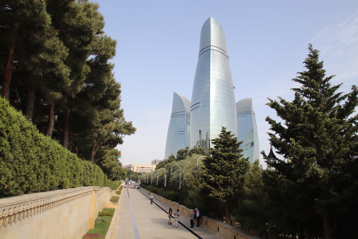I’ve had a very full day exploring the lovely city of Baku today, confirming my initial impression that the city’s character is strongly European (in spite of its location, which is clearly in Asia), and that it is as elegant, sophisticated, orderly and clean as any city in Europe. It is a tasteful mix of an old walled city, surrounded by beautifully maintained opulent classical buildings, interspersed with some breathtakingly bold examples of the best of modern architecture. It is unusual among post-Soviet cities in that it is located within a buoyant economy based upon rapidly expanding oil exports. Streets that have been converted into wide pedestrian malls are lined with a mix of expensive brand-name boutiques, kerbside tea houses and lines of shady trees, all this is backed by the blue waters of the Caspian Sea in a beautiful climate of warm temperatures in the mid-to-high twenties (at least in autumn, which is when I am visiting).
