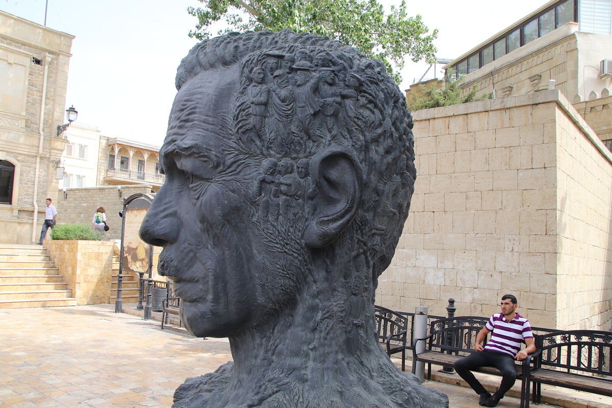 Upon entering the Old City, we stopped briefly to admire a large statue of the head of the famous Azerbaijani poet Aliaga Vahid (1994-1965) who “defied the tradition during Soviet times of glorifying the state by writing poetry that described life as it really is”. The statue was interesting because a close view of his hair showed details from the stories told in several of his poems.