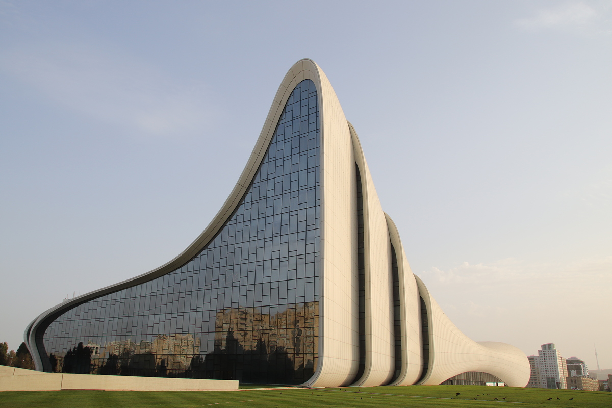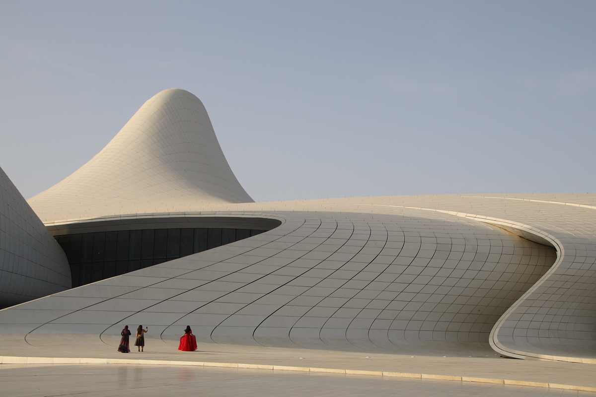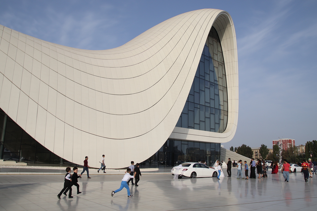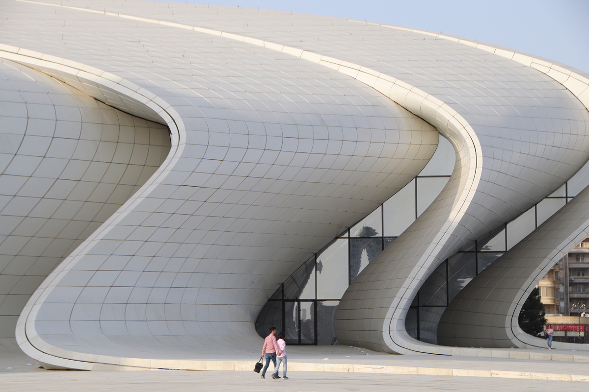 It was 5:00pm by the time we walked back to the Old City where our hotel was located. While some members of the group decided to walk to the Carpet Museum, I (with seven others) decided instead to go and visit the Heydar Aliyev Centre, perhaps the most spectacular example of modern architecture in Baku. Named after Heydar Aliyev, who was the person who is said to have brought independence and welfare to Azerbaijan, the exterior design of the building is said to mimic the signature of Heydar Aliyev – certainly there is not a single straight line to be seen. The Heydar Aliyev Centre is a multifunction complex with exhibition rooms, a conference hall, performance spaces, a gallery and a museum. It is also the preferred backdrop for wedding photos; while I was there, there was a constant procession of white wedding cars bringing young couples to have their photos taken in front of the building. The building looked fabulous in the late afternoon light and the views across to other parts of the city were also wonderful; I can’t recall enjoying photographing a single building as much as this one.