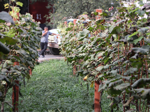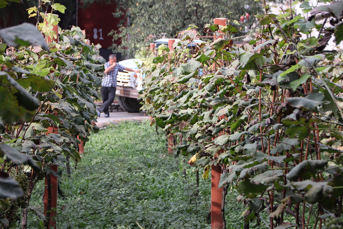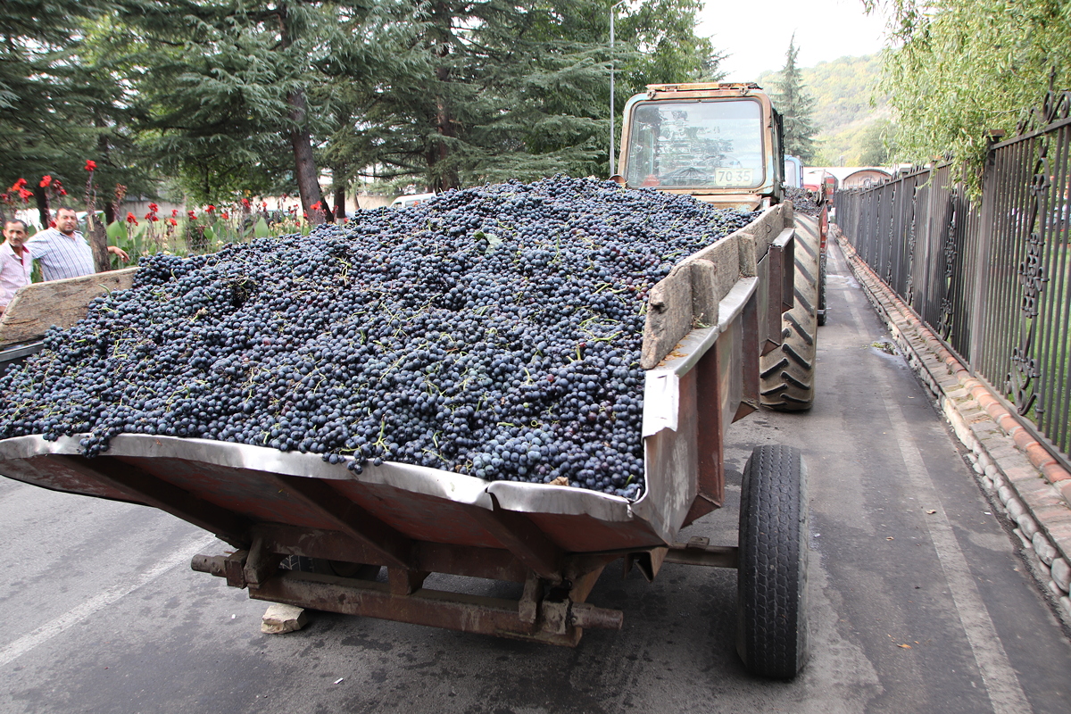 Our destination was one such winery with a unique underground storage facility near the town of Kvareli. Known as Khareba wine cellar, it was located in a tunnel carved into the rock of a small hill where the temperatures were so cool that many people had to put on some rugs supplied by the winery. Originally built for military purposes, the tunnel is used these days to store wines in bottles and in vats, both oak and clay. The main purpose of visiting Khareba was for wine tasting, so not being a wine drinker, I took a short walk to the wine factory next door which was far more interesting, as there was a line of perhaps 50 trucks and tractors bringing full loads of grapes for selling to the winery.