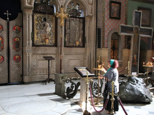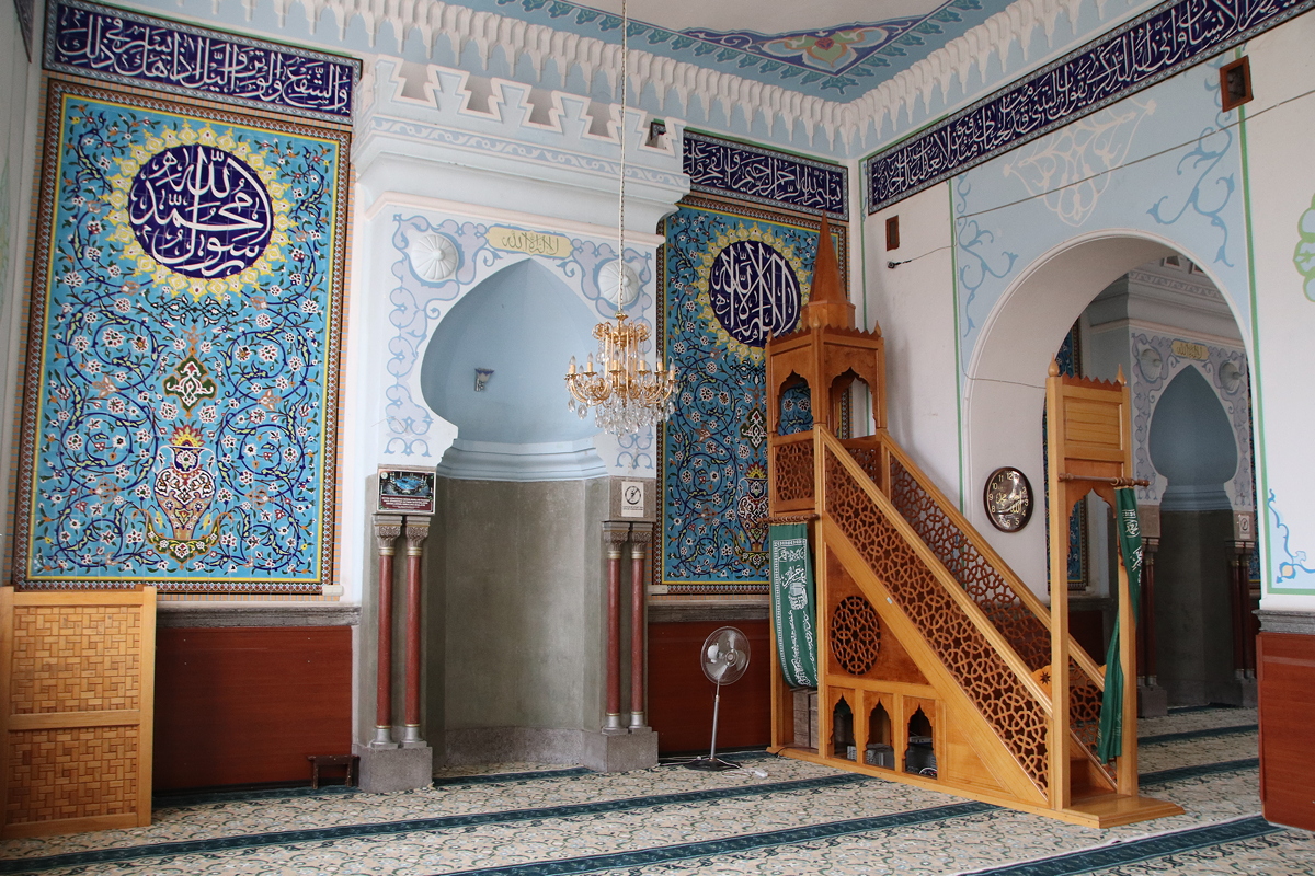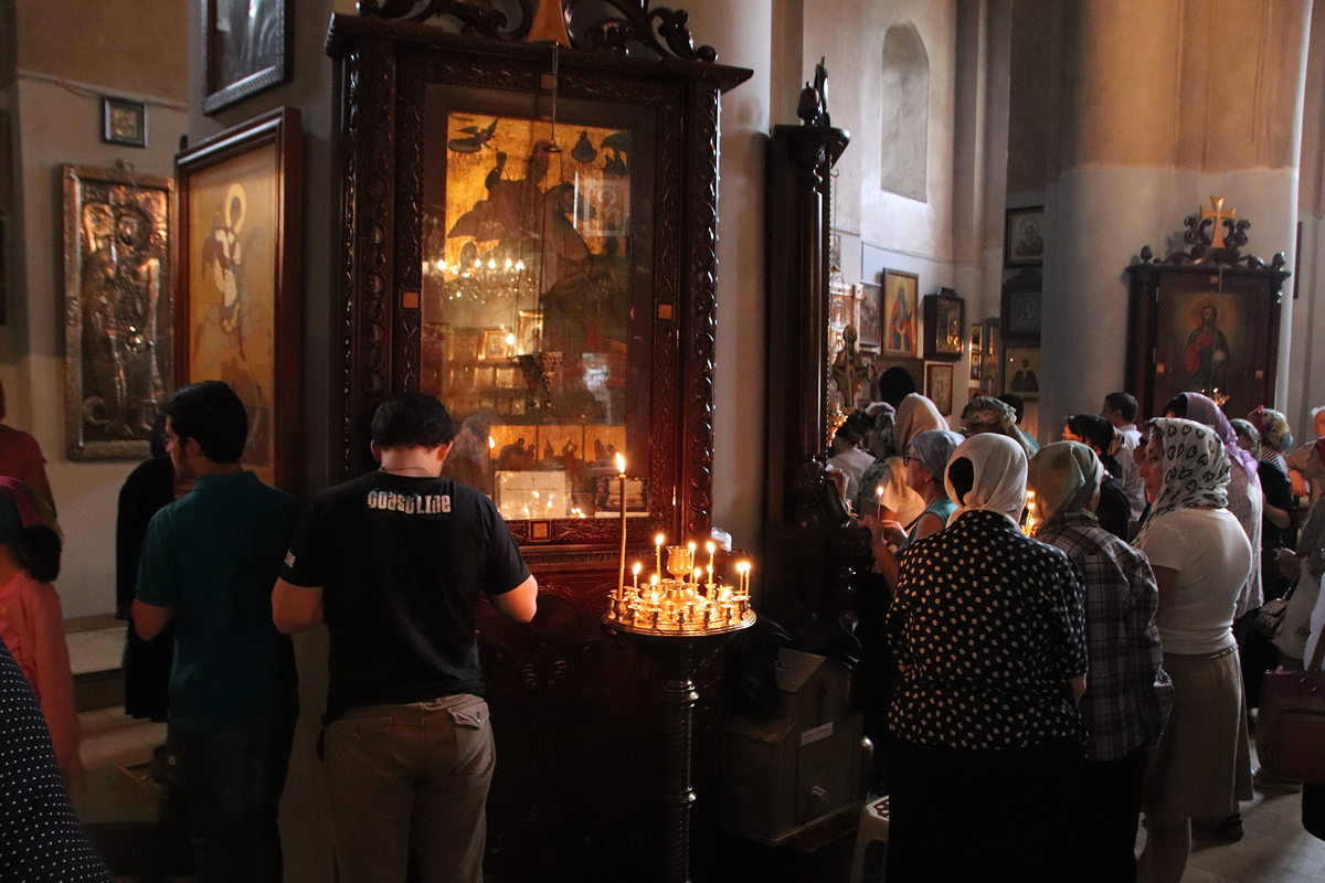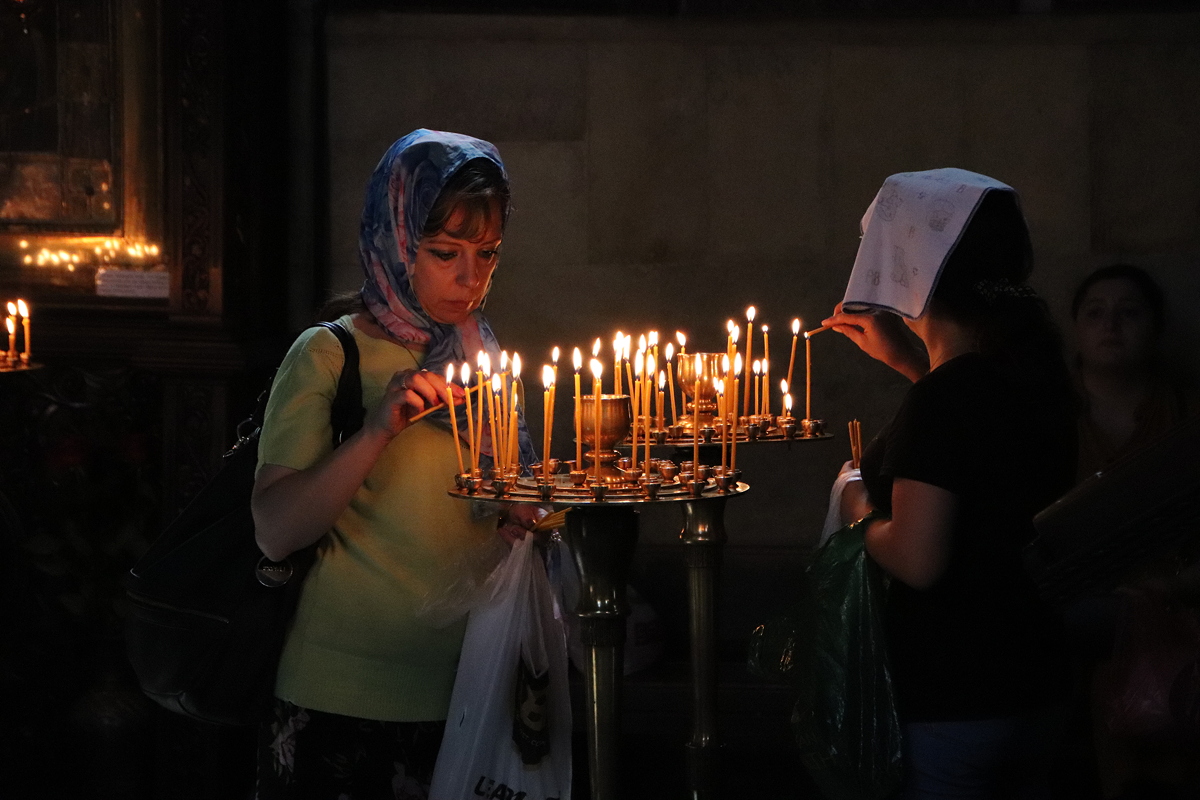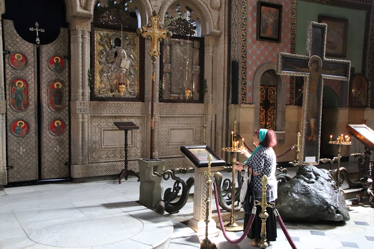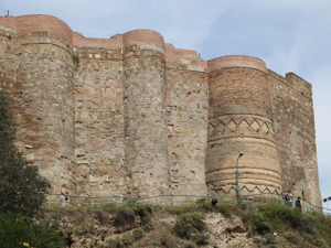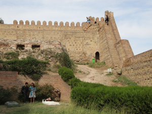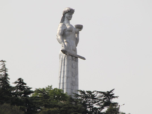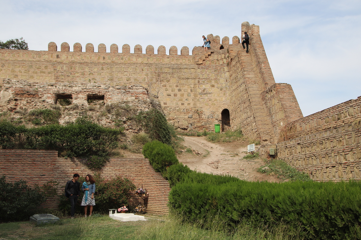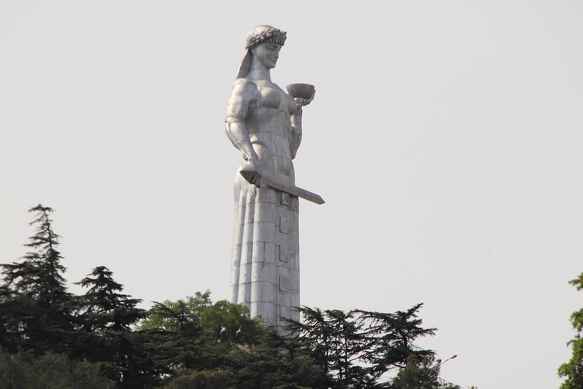 It was just a short walk from the Berlin Wall monument to Europe Square and the cable car station where we boarded cable cars for the short trip across the river and up the hill on the other side to Narikala Fortress. The top cable car station gave wonderful panoramic views over Tbilisi, exposing the vast array of architectural styles spreading over the steep hills on both sides of the river. The hill was topped by a 20 metre high aluminium statue of a woman holding a sword in one hand and a cup of wine in the other, officially known as Kartlis Deda (or Mother Georgia), but apparently known unofficially as “Tin Tits”. A church within the fortress walls had a service underway, which meant we couldn’t go inside, but a short walk down the hill led us to Tbilisi’s one and only mosque. We were welcome to enter and photograph the mosque which, interestingly, is a place where Sunnis and Shi’ites worship together in harmony.