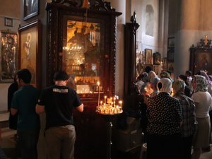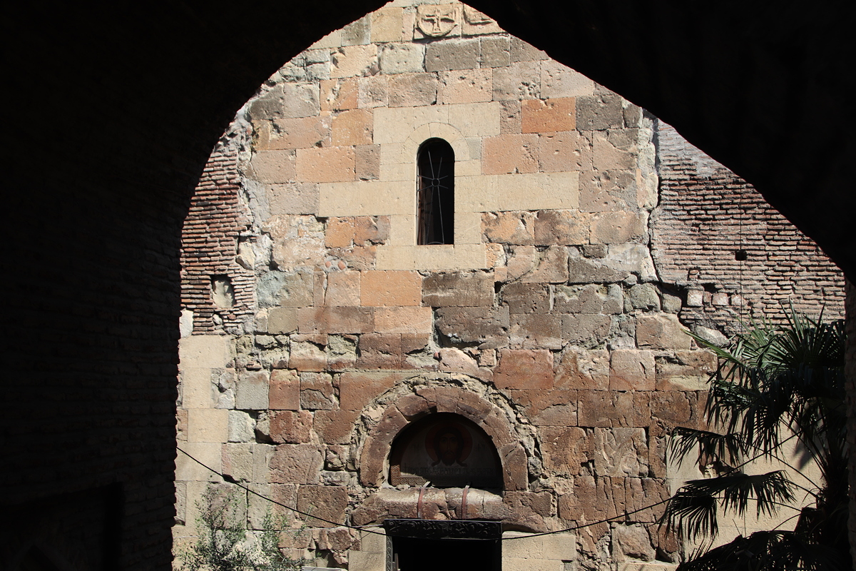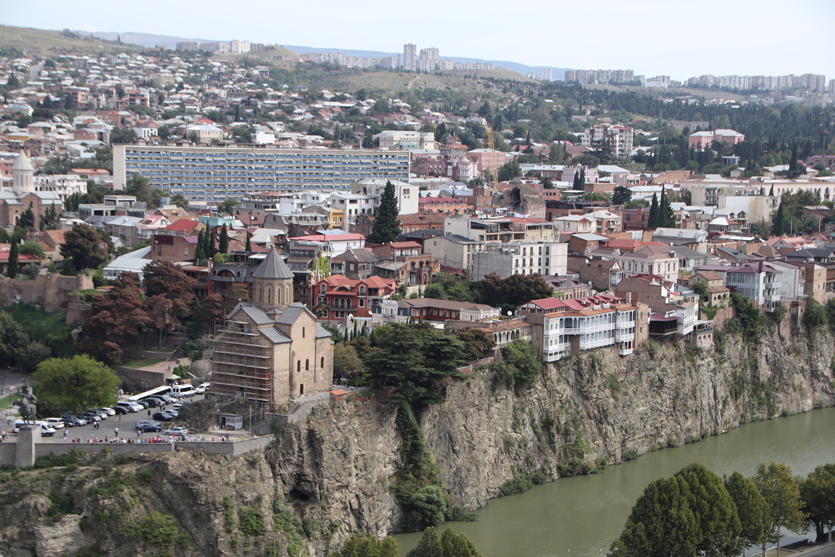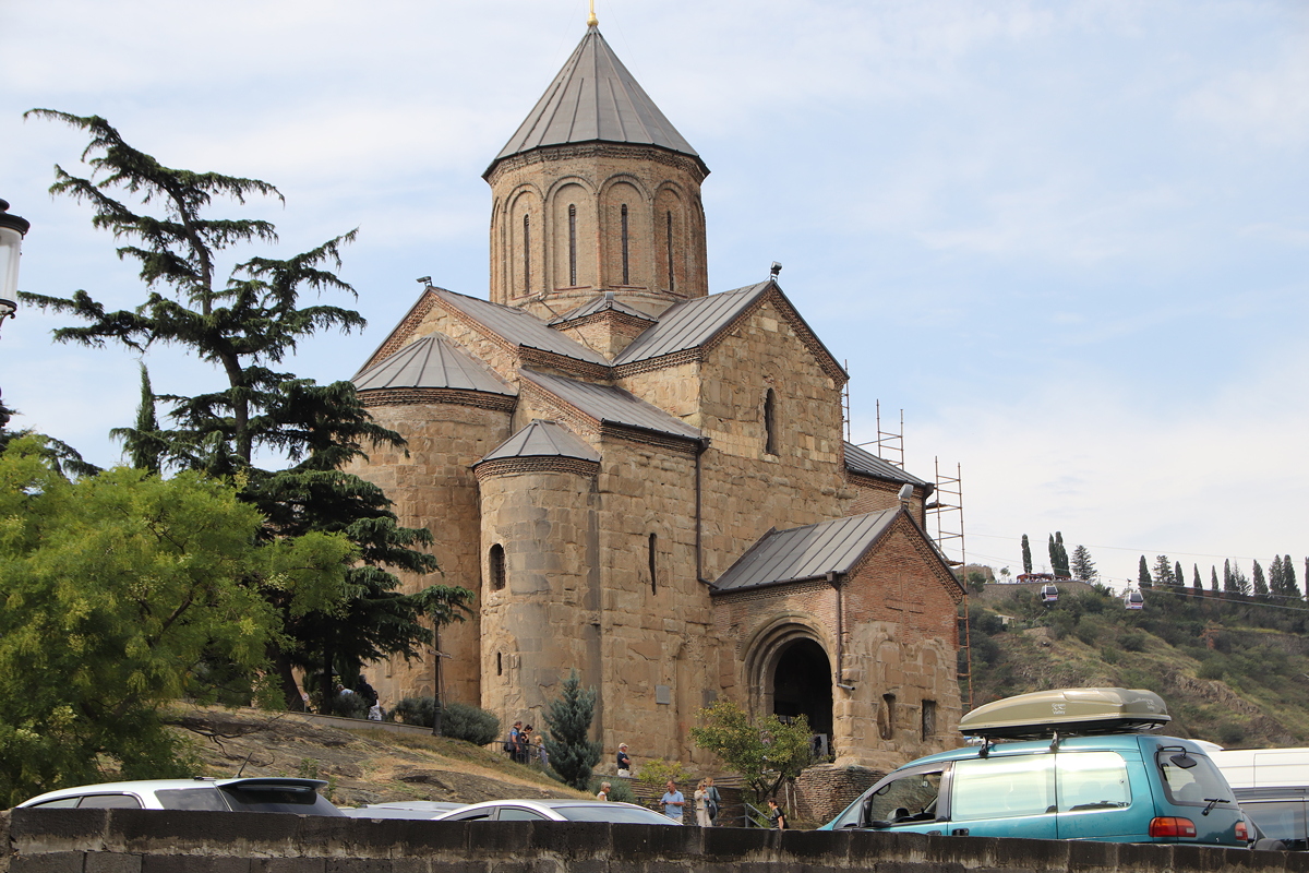 We had a new guide, Mariam, to lead us through the walking tour of Tbilisi as the guide we have had since Baku, Anna, needs three days off to see her surgeon. Under Mariam’s guidance, we took a short bus trip from the hotel to the old centre of Tbilisi just a few kilometres away and climbed the hill to the Metekhi Church. This church was built at the top of a cliff that forms a high rocky outcrop on the left bank of the Mtkvari River overlooking the main part of the old town across the river on the right bank. The church was built (and partially destroyed) during and after successive invasions over the centuries beginning in the 5th century. Major destructions occurred during the Mongol invasion of 1235 and the Persian invasion of 1795. During Soviet times, the church as closed as a place of worship and converted into a prison in the 1920s, and then a theatre in 1974 before being reconsecrated in the 1980s. Mariam gave us a very detailed (hour long!) description of Tbilisi’s history in front of the church before we went inside (but only briefly because a service was underway), and then walked down the hill to begin our walking tour.