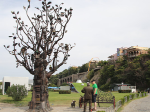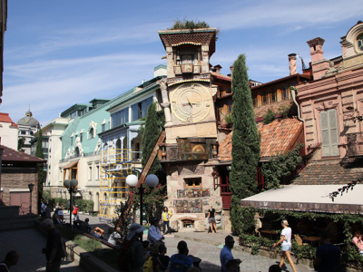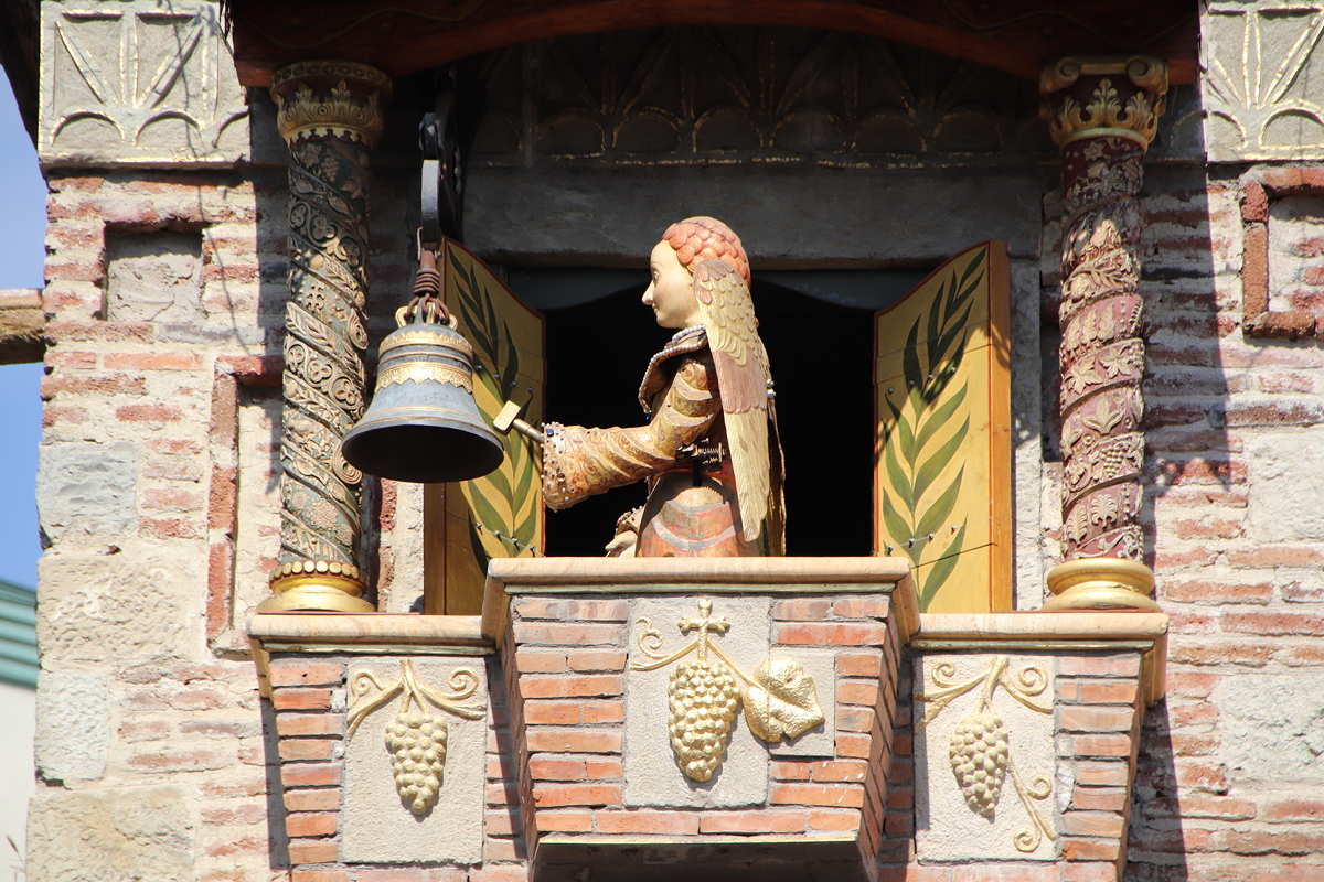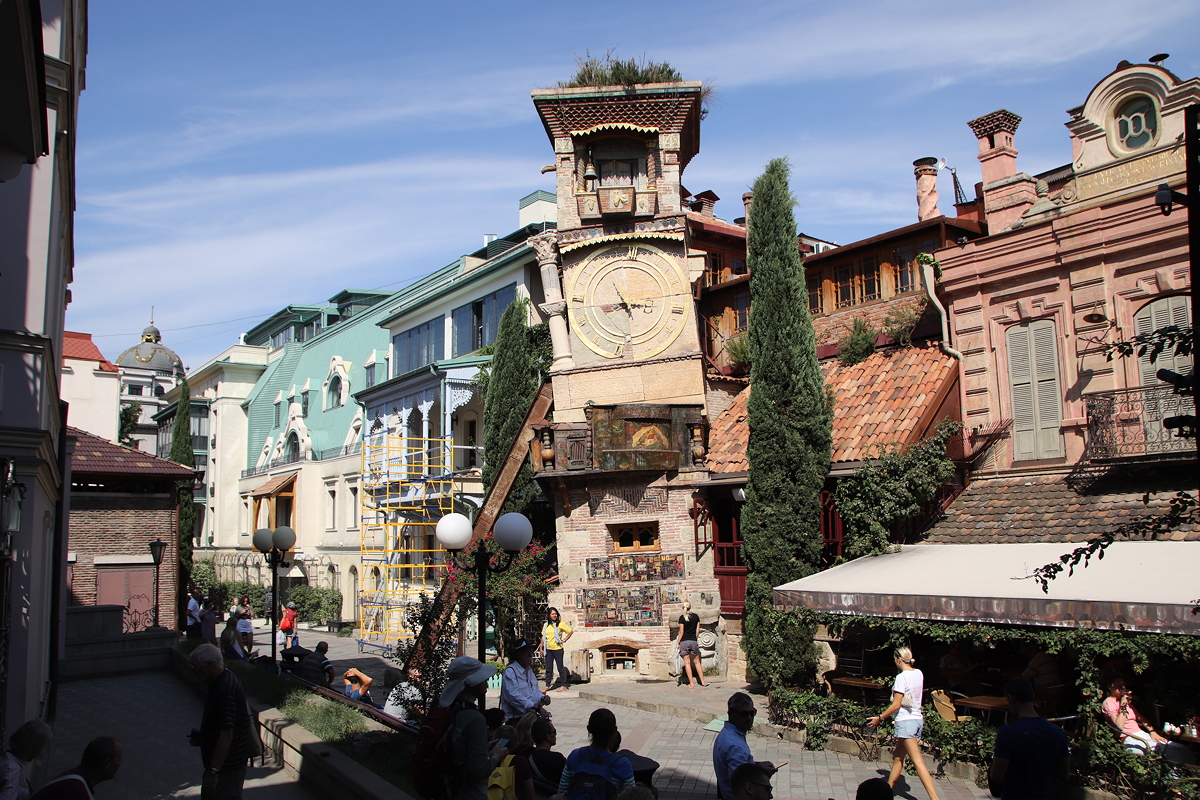 We stopped by a couple of Tbilisi’s older churches before taking a one hour break from 1:00pm to 2:00pm for lunch. There are so many little restaurants and cafes in Tbilisi’s old town that offer amazing food at low prices that we were spoilt for choice. Meeting again after lunch, we continued walking northwards through the old town, diverting briefly to take a walk across the very modern Peace Bridge and back, and finally stopping by what looked like an ancient collapsing clock tower that was in fact built new in 2010 using discarded materials from various other old demolished buildings. In addition to the main clock face, it also contained Tbilisi’s smallest public clock, being what looked like a tiny wrist watch set into the stonework near the base of the tower. At 3:00pm, an animated wooden angel emerged and struck the bells at the top of the tower three times to the delight of onlookers.