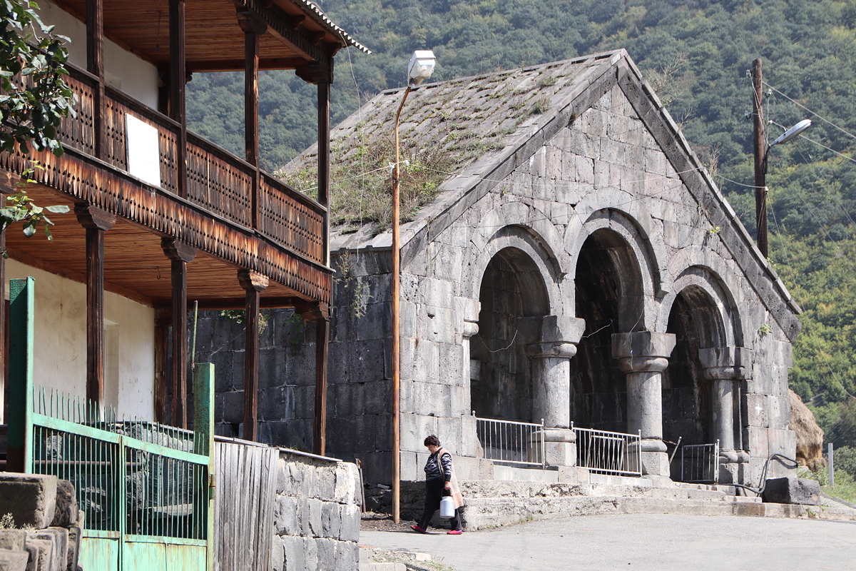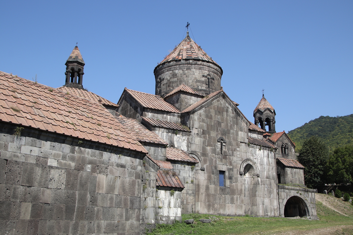 The border crossing took us an hour and a half, including time to exchange money at the supermarket immediately after the border crossing, and after that we spent 45 minutes to drive to our first stop, the UNESCO World Heritage Site of Haghpat monastery. Founded in 976, the monastery complex contains several churches, a scriptorium, a refectory, several chapels, a well spring, and a number of other buildings that collectively represent a stunning example of Armenian traditional architecture, most of which dates from the 10th to 13th centuries. Standing on the lip of the edge of the Debed Canyon, Haghpat overlooks the river and the surrounding countryside of forests and farmland – unfortunately partially obscured by the thick, white, toxic smoke belching upwards from the remaining copper mine and smelter in Alaverdi. The location of the monastery may have been chosen to protect the peace and seclusion of the monks, but today it is located in a terrible situation from a health perspective – our visit was marred by the strong metallic, slightly headache-inducing smell of the white fume-infused air.