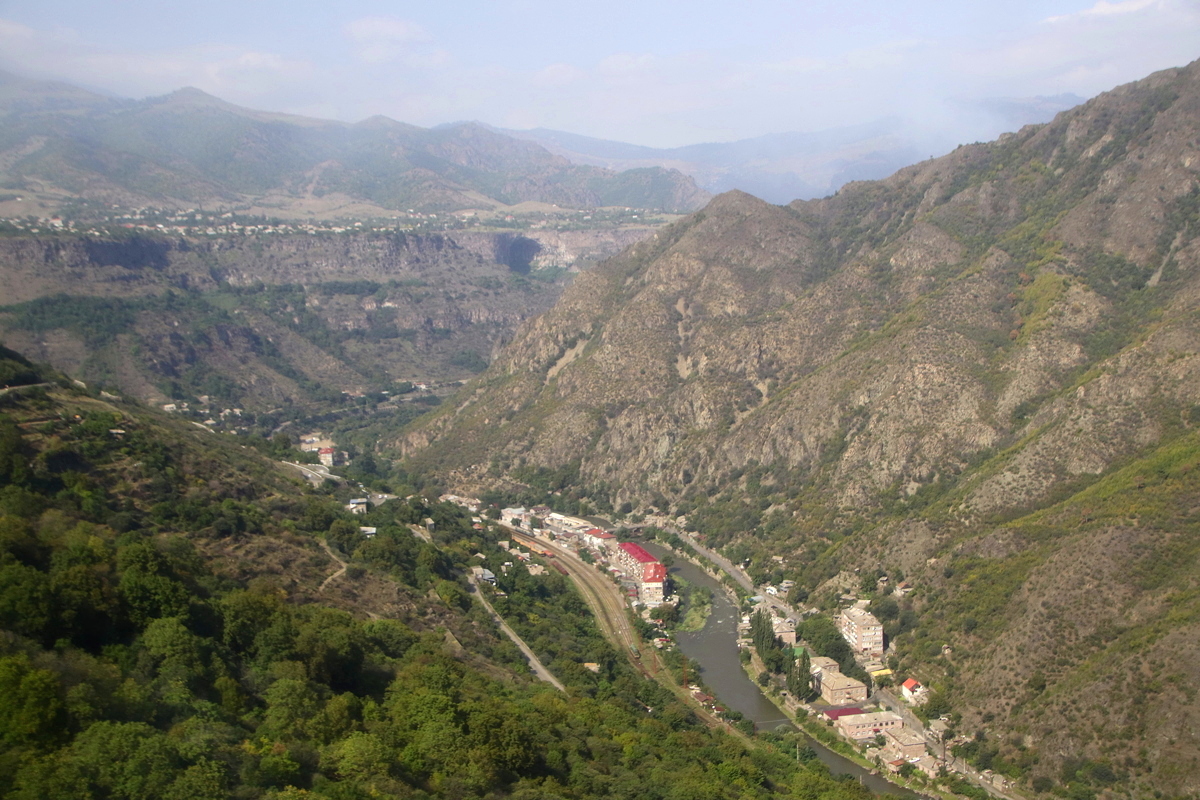 After a one hour break for a shared lunch at a riverside restaurant at the bottom of the hill from Haghpat, we began the long drive towards Yerevan, Armenia’s capital city. As the main road was under repair, this meant taking a lesser road that zig-zagged up a steep 300 metre climb to the village of Odzun, giving magnificent views of the countryside. Unfortunately, there won’t be many photos through the bus windows in Armenia as the windows are covered in a dark, highly reflective film that both darkens everything and gives a mirror-like reflectivity unless the combined angles of the sun, bus, window and camera are perfectly aligned – not easy on bumpy, twisting roads. Nonetheless, I have shared some of the few photos I managed to get through the windows to give some idea of Armenia’s beautiful landscapes, even though the reflective film does tend to suck the colour out of any photo.