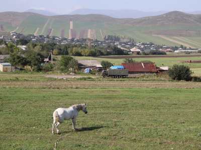 Turning south from Dilijan, we drove through the 2.5 kilometre ‘tunnel of death’ (so named because the poor ventilation system causes a build-up of fumes, and furthermore the lights inside are turned off during the day – go figure!), and when we emerged we were in a totally different environment. Gone were the steep slopes of bright green grass with forests interspersed between them and dark clouds overhead. Instead, we had gentle slopes, no trees, grasslands and clear sunny skies above us.