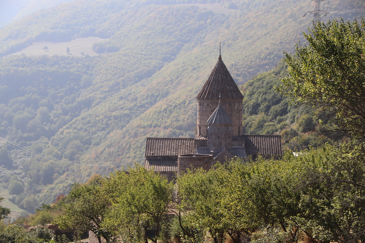The main reason we has travelled all the way to Goris and stayed there overnight was to visit the Tatev Monastery, described as “the jewel of mediaeval Armenian architecture”. Getting to the monastery, which is situated on a precipitous rock outcrop at the edge of a deep canyon, was half the fun. The journey was made via a cable car known as the “Wings of Tatev” which is (according to the Guinness Book of Records) the “world’s longest reversible aerial tramway” with a distance of 5,752 metres.