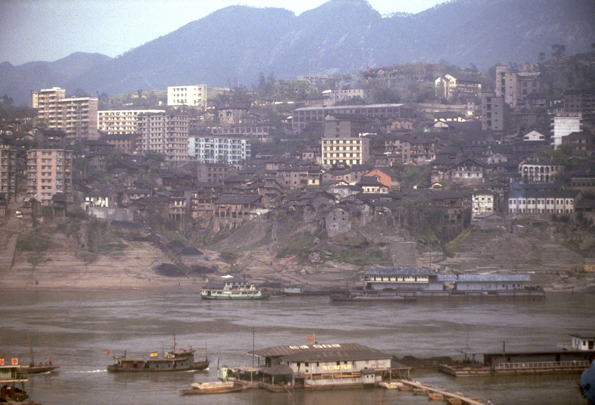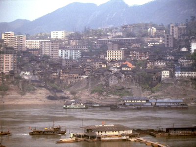 I can understand why they call Chungking the mountain city; it is mostly built on cliffs, which helps explain why there are far fewer bicycles here than in Kunming – travel is by foot or by bus. The buses include trolley buses in steep areas, and there are some buses with large gas bags on top of them. Many of the buses are actually made in Chungking. There are several tunnels built through the hills because they are too steep to build roads over the tops. There is also a cable car linking the two sides of the Yangtze River, which flows through the city.