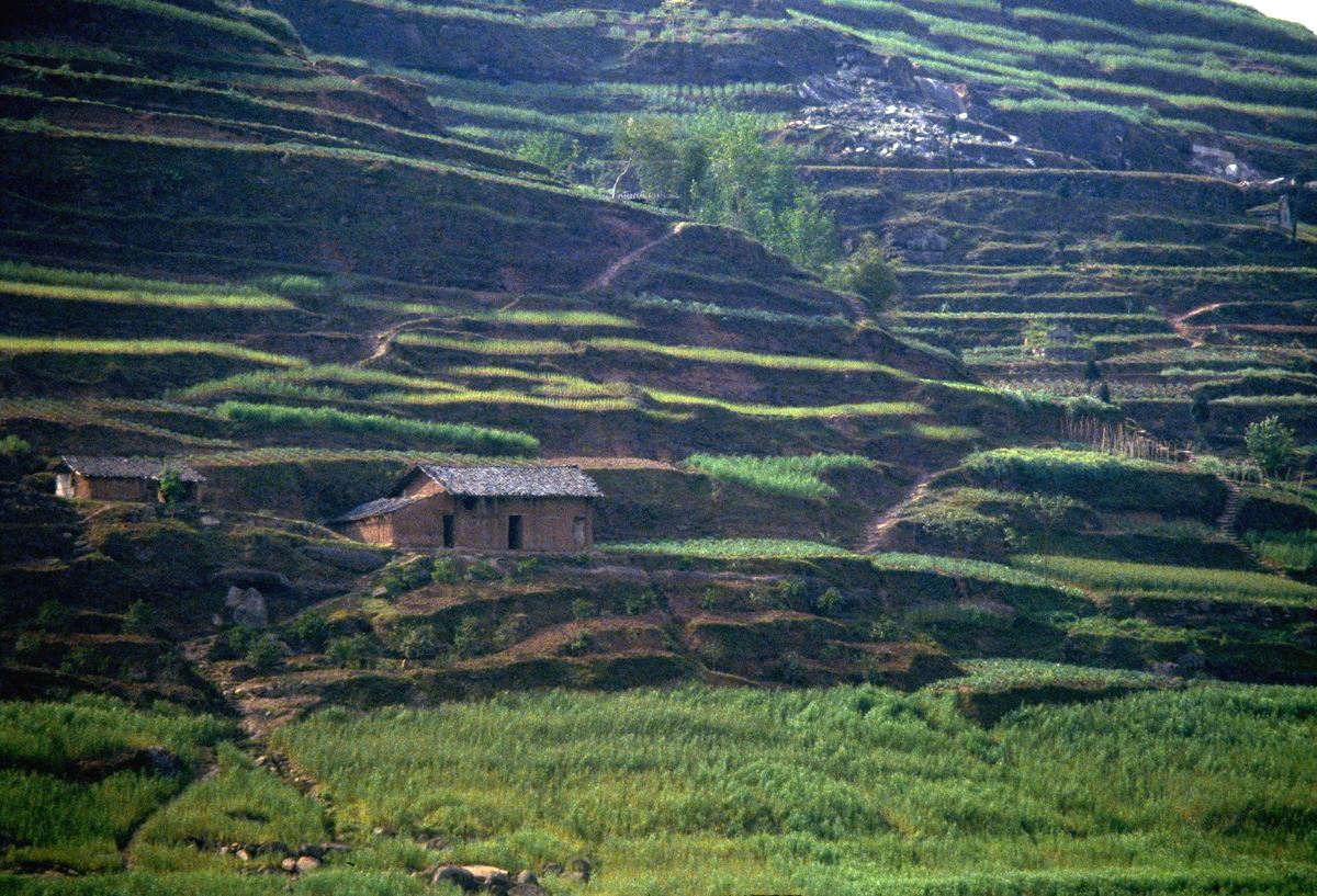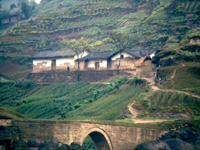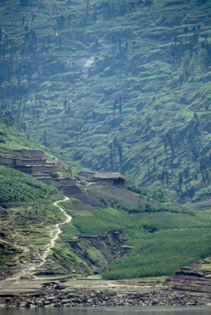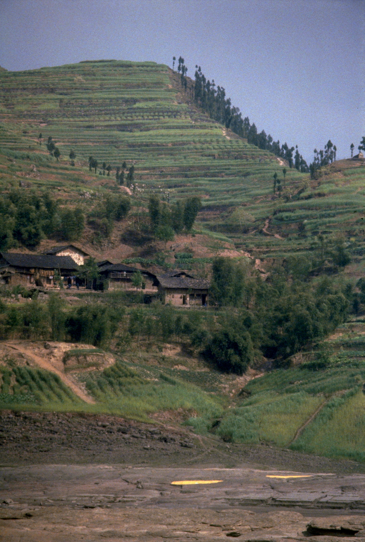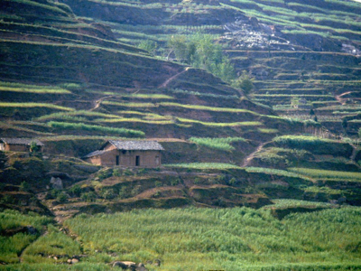 For most of today we have been travelling through poorly terraced hills growing wheat. Geology has played a strong role in shaping the area – for much of its course the Yangtze follows a geological syncline in the sandstone rock, and the terraces often follow the sedimentary layers rather than being horizontal.