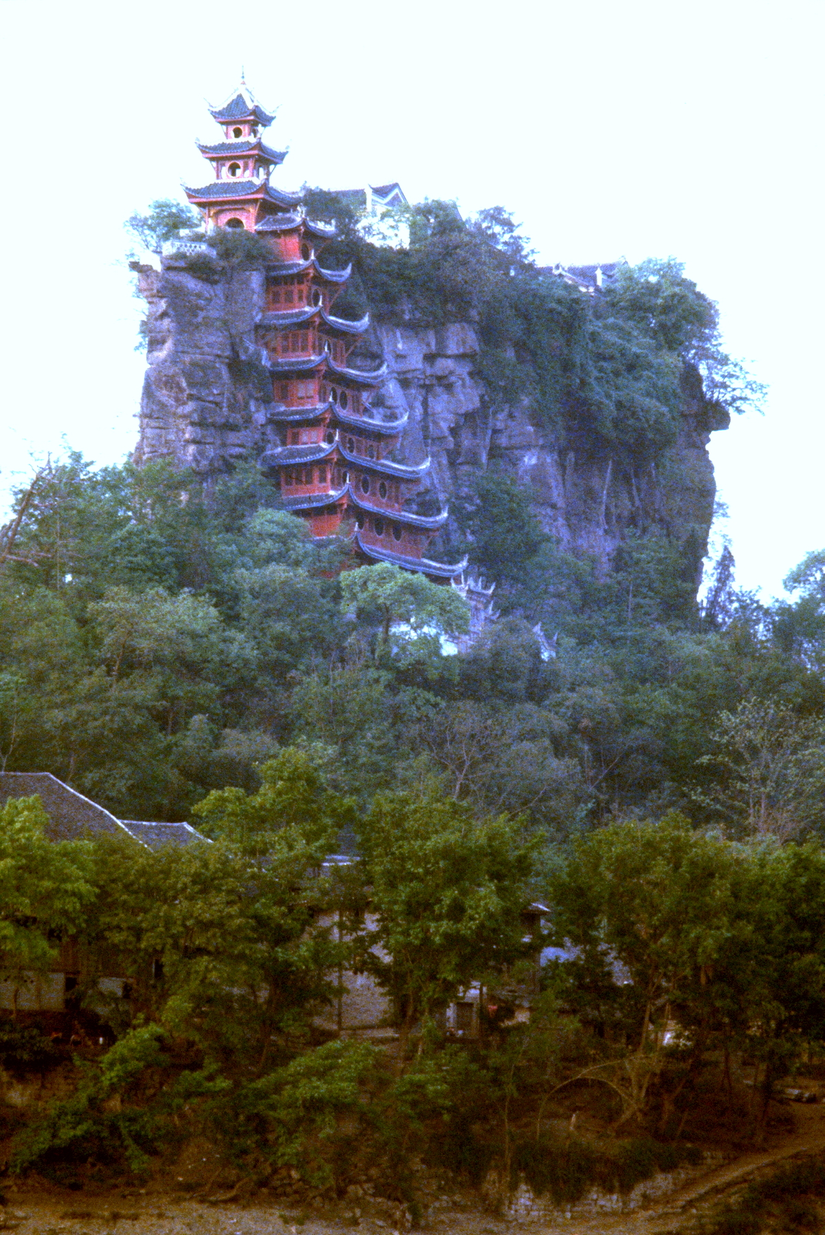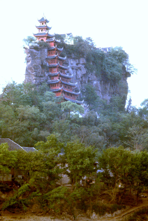 After passing Fengdu and Zhongxian, and as dusk approached, we came to a 30 metre high pedestal rock with a temple on top. The rock is called Shibaozhai, and the temple was built in the late 1700s. There are rumours that a large dam will be built on the Yangtze River in coming years (the so-called Three Gorges Dam), which will flood the temple and many of the small villages we are passing.