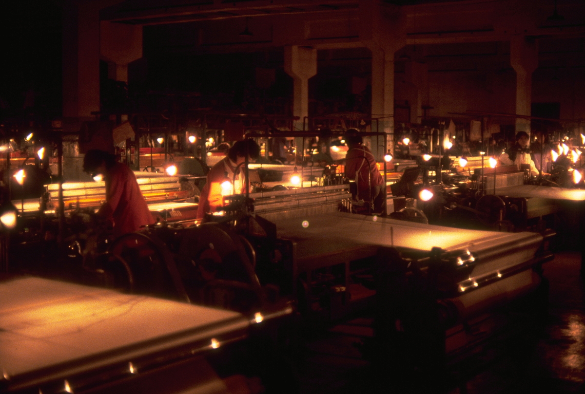 Wanxian is a “mountain city”, which I have learned is a Chinese expression for “built on a cliff face”. The narrow, winding streets represented old China at its best – unfortunately far too dark for photos of course, even with my 400ASA film. After passing a tower built during the Tang Dynasty (618-907AD) at the highest point of the town, we arrived at the grey brick workshop-like building. The factory operates 24 hours every day, seven days per week, so we were able to begin the visit by looking at its operations. It has five sections: spinning, weaving, dying, finishing and machinery repairs, of which we visited the first two.