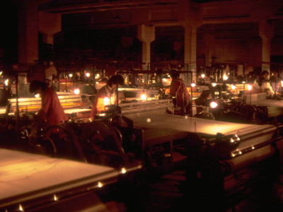 Some card reading machinery was used to weave jacquard patterns , but on the whole, the machinery was old and noisy with poor lighting (dull bare light bulbs over each machine), using wooden bobbins. There were no obvious protections against noise or unsafe machinery. Most of the staff were young, with some in their teens, and there were both males and females, although females were more numerous.