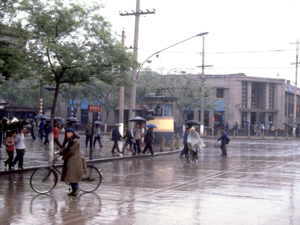 The Bell Tower is located at the junction of roads leading off to each of the north, south, east and west. Sian is a very old city with a history of more than 3,000 years. Sian served as China’s capital city intermittently for over 1,100 years, and its present appearance reflects this rich past. There is even an intact city wall through which one must pass to reach the city centre. By the Tang Dynasty (618 to 907 AD), Sian had a population of a million people, making it one of the world’s largest city. After the capital moved away, however, the population declined.