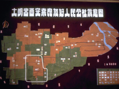 We were shown a wall map of the commune that apparently measured about 10 kilometres wide (east-west) by 5 kilometres north-south. Green areas represented areas of vegetable cultivation, while brown areas represented areas of grain cultivation. The white circle indicated the area containing the ruins of the Tang Dynasty palace after which the commune is named.