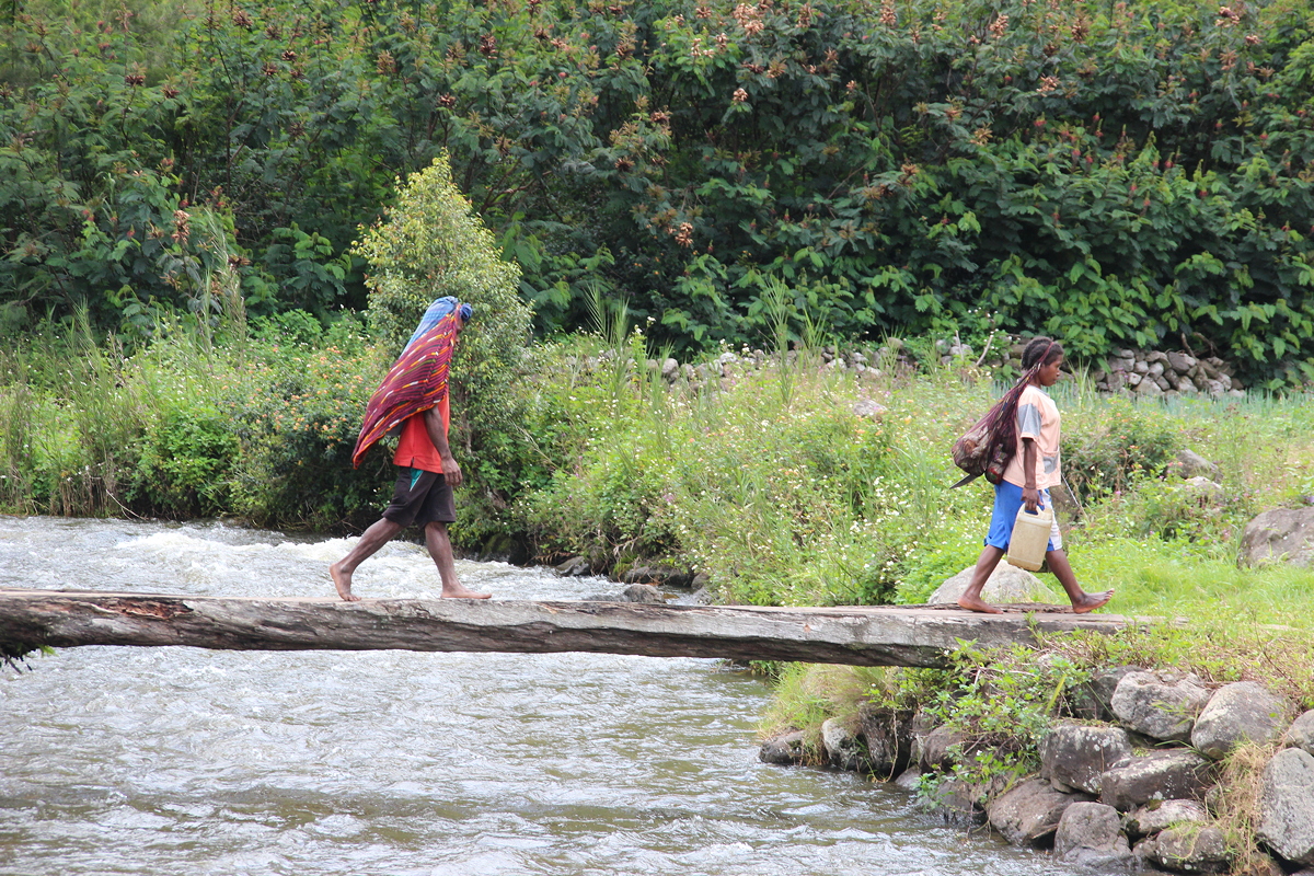 The original intention was to head south to the end of the road at a village called Sogogmo, about three kilometres before the district centre of Kurima. However, several bridge washouts and road collapses meant we could drive only as far as Hetigima. A temporary wooden surface had been placed across the river where the bridge had been, allowing foot traffic to pass but nothing else.