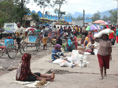My second stop in Wamena was at the southern end of the town in a district called Wouma (pronounced war-ma). There was a large Catholic church there, with a school next door in session (yes, it’s Saturday, but schools here operate six mornings per week). The main attraction, however, was the large market area, with Dani people selling their crops and their cut timber from stalls that were nothing more than a cloth on the pavement with their produce arrayed neatly – indeed artistically – on top. Herriman (my guide) told me that at one time during the political turmoil of the late 1990s and early 2000s, about half the shops in Wouma had been ablaze.