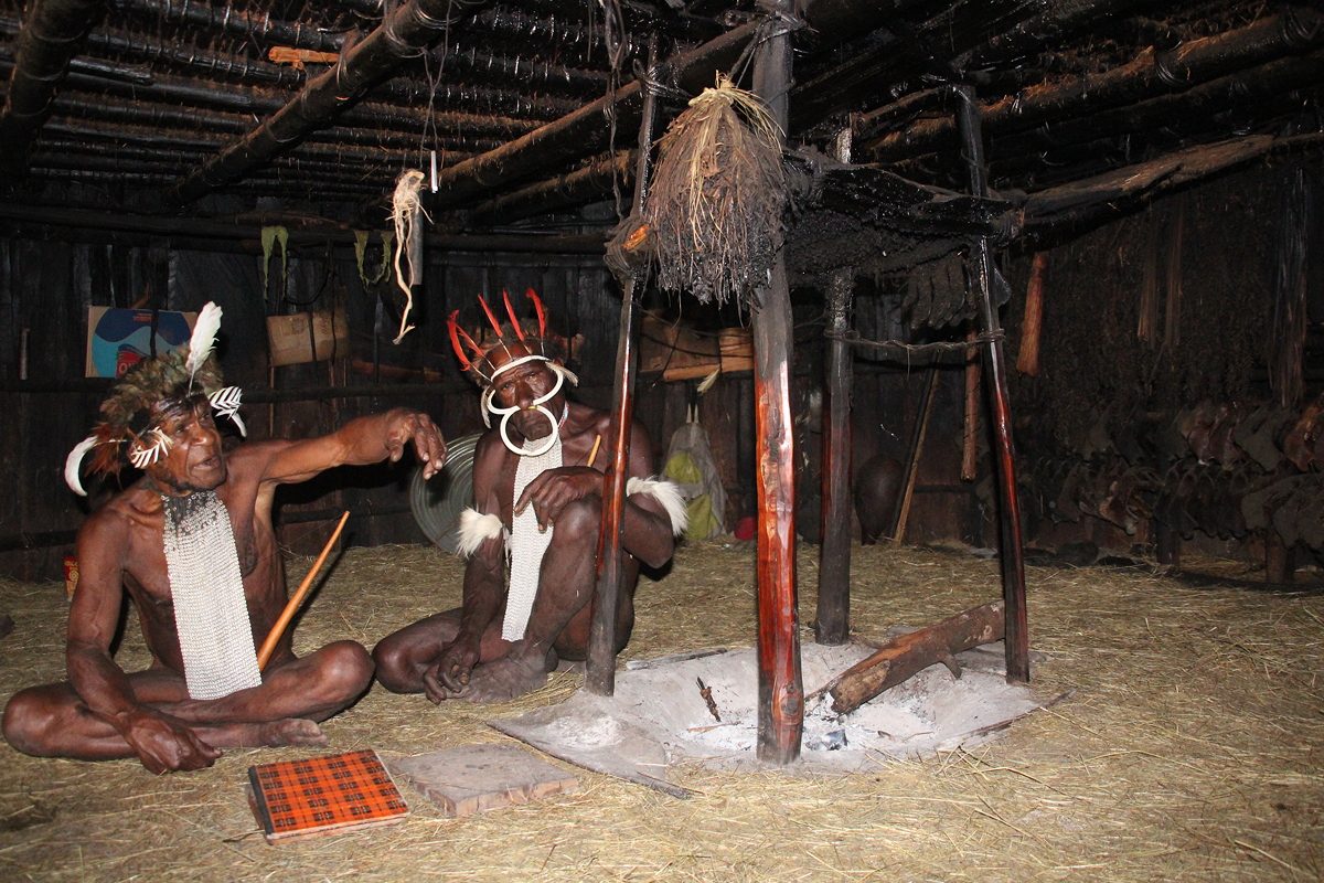 I sat on the straw floor and listened to Yali describe the layout of the hut in which he grew up and still lives. In the centre of the lower level, there is a place for the fire that provides warmth and smoke for the men sleeping on the upper level. On the wall were ornaments used in ceremonies, and in front of the fire were a couple of small charms. Although they are Christian, these Dani still follow some of the traditional beliefs in spirits. It highlighted to me how the age-old beliefs continue even though the traditional clothing is being abandoned, walking is being replaced by motor bikes, sweet potatoes are being supplemented by fast food, some cultivation of sweet potatoes is being abandoned as the government hands out free rice, and many Dani huts now have television sets.