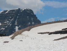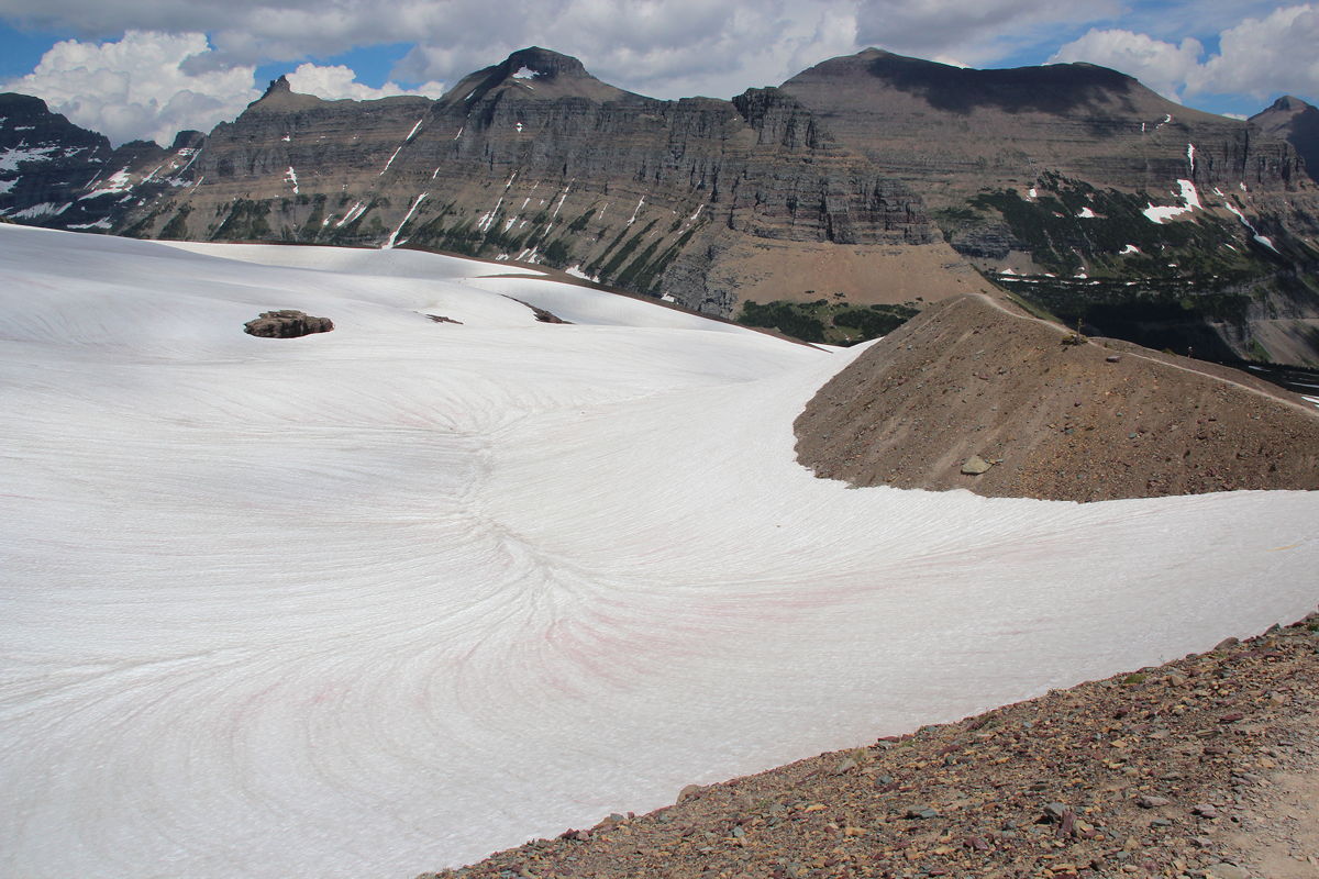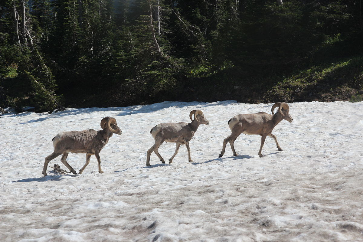 Our main activity today was a hike through the snowfields from Logan Pass (which marks the continental divide between the Pacific and Atlantic watersheds of continental North America) and Hidden Lake. Although this walk was only five kilometres round trip, and required a climb of only about 300 feet (up from 6646 feet at Logan Pass), it took us about four hours. There were two reasons for this slow progress. First, the scenery was outrageously picturesque, so I had to keep stopping to get photos. Second, and no less significantly, most of the walk required us to walk across the snowfields that were still burying the boardwalks that will no doubt be exposed as the snow melts in a month or two.