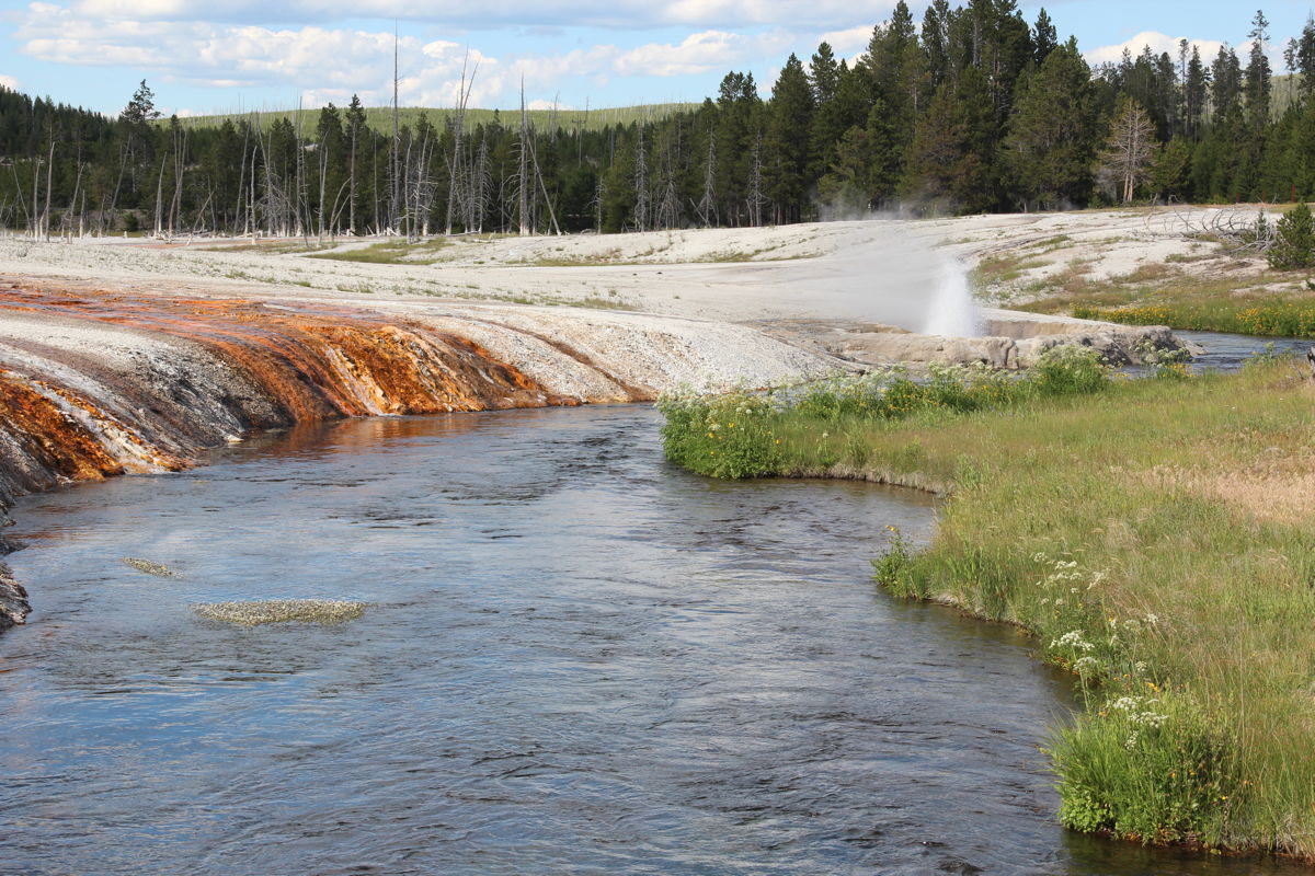 By the time we reached Old Faithful, the skies had cleared and were largely cloud-free once again, so we took the time to visit a small thermal area that we had not had time to include on our south loop drive. Known as Black Sand Basin because of its dark obsidian (volcanic glass) sand, the area comprised several small but extremely active geysers and three hot lakes with colourful edges caused by the thermophite activity.