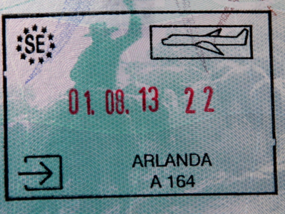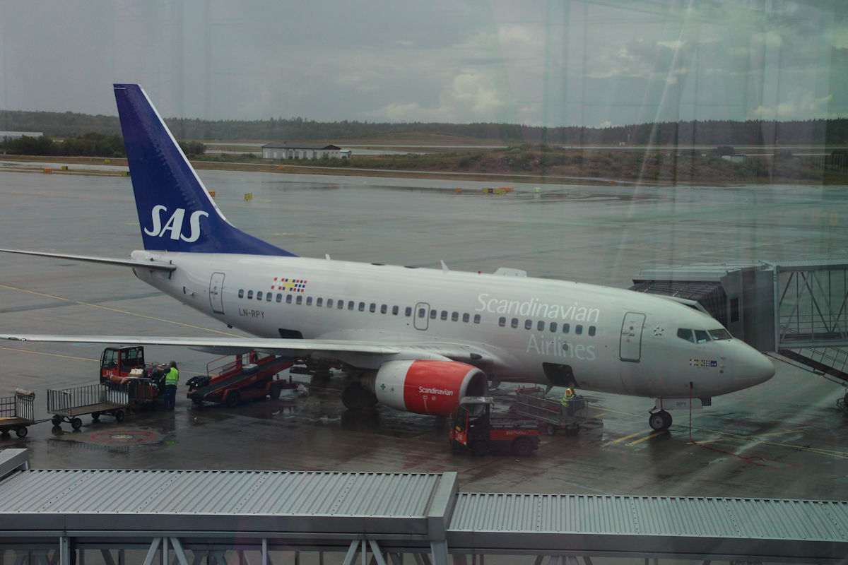 Our plane to Stockholm had many vacant seats so both Di and I were able to have window seats with two spare seats beside each of us. On the approach to Stockholm’s Arlanda Airport, we passed over the city centre of Stockholm. It looked magnificent but I could not get any decent photographs as my seat was situated over the wing and a rainstorm was obscuring parts of the view below.