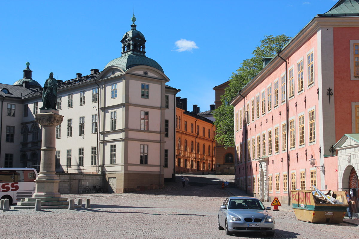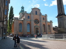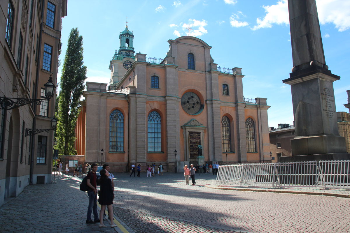 Given that today’s weather was ideal for walking, we confirmed our plan to explore the two historic islands that we had seen from the top of the Tower on foot. A short walk across a bridge brought us to Riddarholmen, the small island where Stockholm’s settlement began. The island was a beautifully preserved area of old buildings, dominated by a large church and a triangular open area beside it, which today was partially filled by a large, poorly parked, vulgarly painted tour bus.