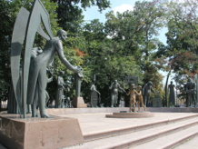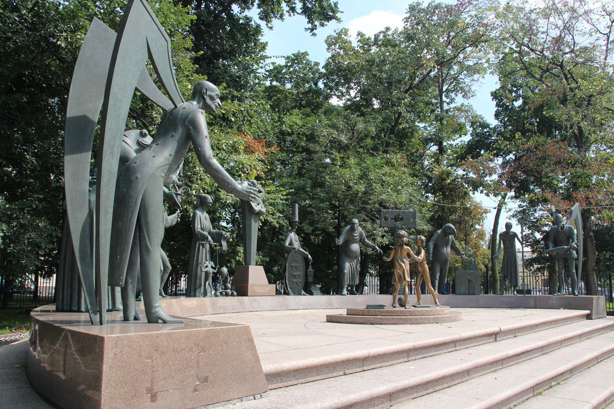 It was good to stretch my legs during the stop. The park was a beautiful sight in the summer sunshine, and the pedestrian bridge to the side was being used by a steady succession of bridal couples for photographs. However, what caught my attention most of all was an intimate collection of sculptures at the north-eastern end of the park with two golden figures of blindfolded children surrounded by 13 grotesque, and in some cases somewhat frightening, characters. Entitled “Children are the victims of adult vices” by Mikhail Chemiakin, it is intended to be an allegory of the fight against global evil. The figures that seem to hover threateningly around the children are helpfully labeled in English as well as Russian: Drug Addiction, Prostitution, Theft, Alcoholism, Ignorance, Irresponsible Science, Propaganda of Violence, Sadism, For those without Memory, Child Labour, Poverty, War, and in central place, Indifference.