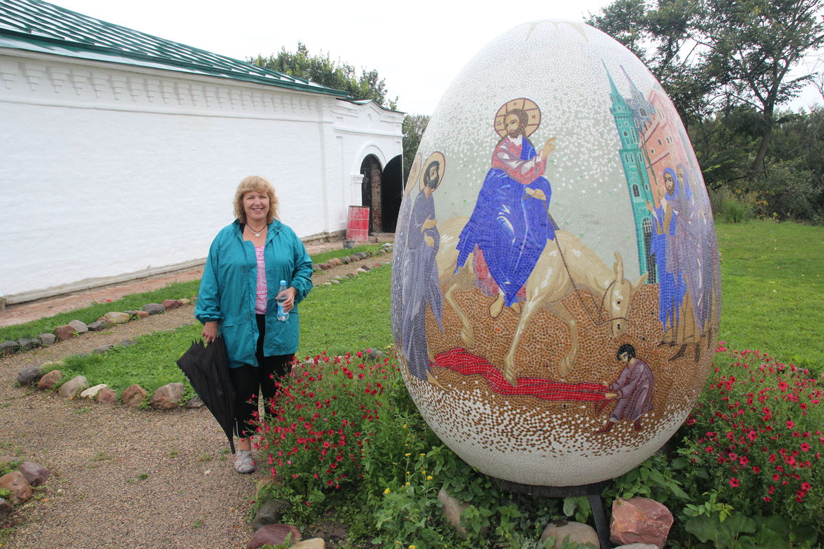 Suzdal is a town that seems to be made for walking, at least on a sunny day. There seems to be something to see at every turn, and as a result we zig-zagged a little as we made our way. For example, one small church that caught our eye behind the old commercial line of shops was under renovation, but featured a most unusual giant mosaic egg in its courtyard showing Jesus’ entry into Jerusalem on Palm Sunday. Another great sight was the Resurrection Cathedral in the middle of the cobble-stoned market square, standing proudly despite its foundations that have visibly shifted over the centuries into some quite odd angles.