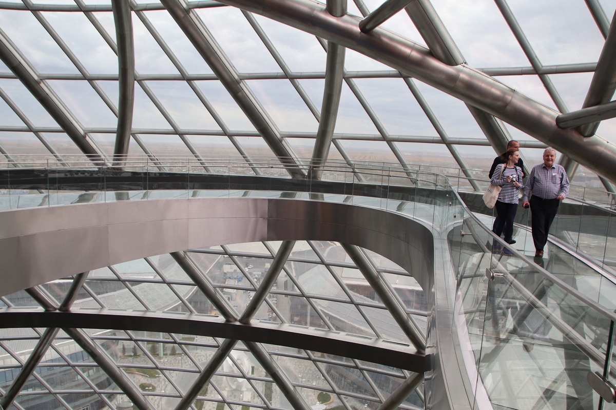 Rather than take yet another short bus ride to the nearby Bayterek Tower, now the icon of Astana, we chose to walk. This was the one place I visited today that I had also visited while in Astana a few weeks ago. The windows are still dirty and overly tinted with yellow reflective film as they were a few weeks ago, but the skies were less overcast today, making the photos from the top a little better than last time although still highly challenging. This visit also brought a more detailed account of the symbolism of the tower’s design, which is supposed to represent a poplar tree (as poplar trees were traditionally thought hold up the sky) and how every year a bird lays a golden egg in its branches, but it is eaten by a dragon, so next year the bird lays another egg, which is eaten by the dragon, and so on and so forth for eternity. Apparently all this represents the need for continual renewal.
