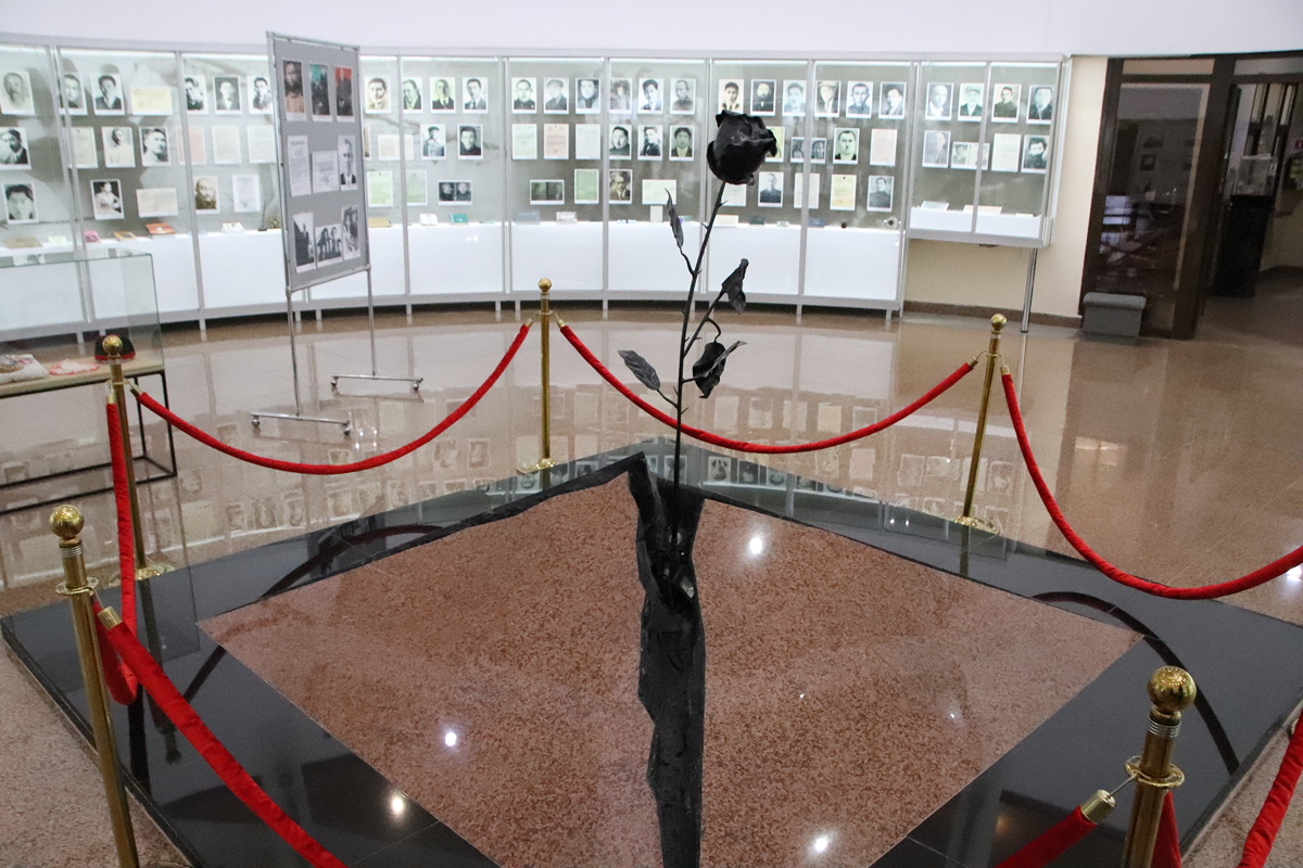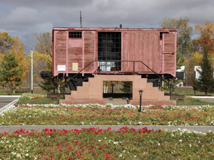 To get to the windowless museum, visitors are encouraged to make their approach through a tall arch, known as the Arch of Sorrows, with heads bowed as a way to show respect to the victims of the gulag. To the left of the arch, there are recreated features such as a watchtower and a railway carriage, but once inside the museum, the display is somewhat more sterile. Although there are a few dioramas and a central display featuring a black rose sprouting upwards through a smashed block of granite, most of the display comprises old photographs and copies of documents.