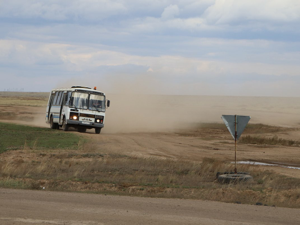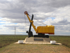It was a 135 kilometre drive from Kurchatov to Atomic Lake, and slow travel on rough, poor roads (though a little better than yesterday’s) meant the journey took five hours. We were told (and geiger counters confirmed) that the area was safe for travel, but strange surface patterns from time to time confirmed that much of the territory we covered had been used for underground nuclear testing over the years. We did make a few stops on the way – one stop to use ‘traditional toilets’ (i.e. the treeless, open grassland of the Kazakh steppes), one stop to admire a large coal excavator that has incongruously been made into a roadside monument, and a major stop at the bunker that was used to trigger the explosion that created Atomic Lake.