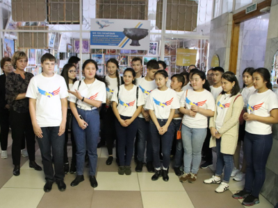 We met the students outside the Nevzorov Museum where they were instantly recognisable by their white T-shirts emblazoned with the image of an eagle with one wing comprising a Kazakh flag and the other wing comprising a US flag. Most of the students we met were aged between 14 and 17, and they were surprisingly confident with their English language skills. They joined us for the tour of the museum, and several short speeches were made before a group photograph was taken.