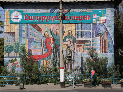 Walking would give me a chance to explore the city, so for me it was the obvious way to go. My impressions of the city didn’t change much during the walk, although I did discover some lovely hidden gems, like a beautifully preserved (restored?) socialist-realist mosaic covering the entire wall of a building, an exquisitely manicured flower bed in front of a Soviet-era housing block that was in a state of severe disrepair, an inspirational mosaic on the end of another Soviet-era housing block showing a soaring Ilyushin Il-62 jetliner, and some panoramic views of Gora Sulayman-Too, a high rocky outcrop that apparently provides great views of Osh.