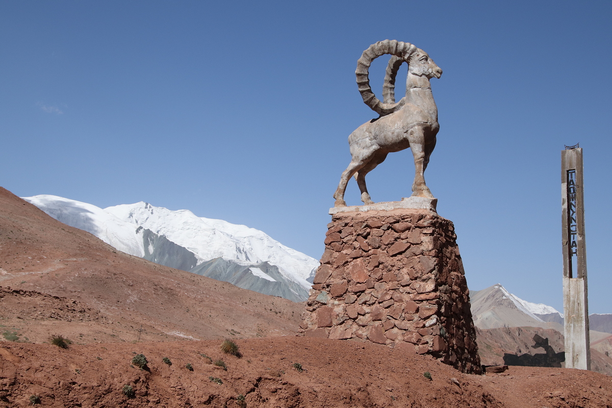 It took only about 40 minutes to reach Bor-Dobo, the Kyrgyz border point. There is a gap of some twenty kilometres between the Kyrgyz border post and the Tajik border post at Kizil-Art, with the actual border being situated at the top of a pass at an altitude of 4,280 metres. It was a bit worrying when two camouflaged Kyrgyz soldiers wearing black balaclavas and carrying Kalashnikov machine guns waved our bus to a stop, and after some words to the driver, got in and sat in the front seats. Intimidating though this was, it turned out they just wanted a lift up to the top of the pass where they got out and, like us, posed for photos (for each other, not for us) at the border point which was marked by two tall (but decaying) obelisks and a large statue of a mountain goat.