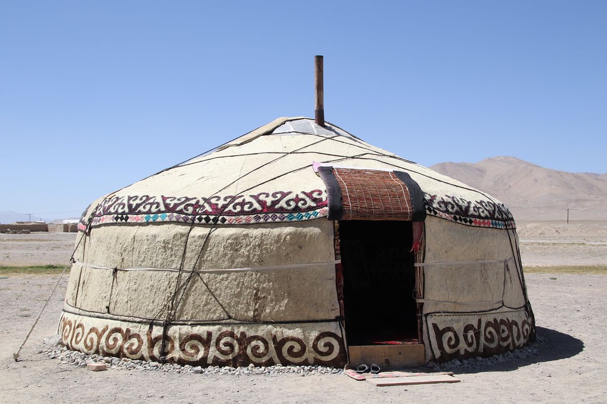 A short drive of just a couple of kilometres brought us to Alitchur, one of only two towns we passed through on the day’s drive. We stopped for lunch, after which we spent a while exploring the town, the population of which is just a few hundred people. The town was not a pretty urban centre, comprising low, flat-roofed dwellings arranged in rows that were separated by linear gaps so wide a small aircraft to land in them. Punctuating the skyline – indeed dominating it – were rows of concrete poles with tall wooden extensions carrying electric wires. Within the town, there were a couple of yurts, which we visited when we were invited inside.