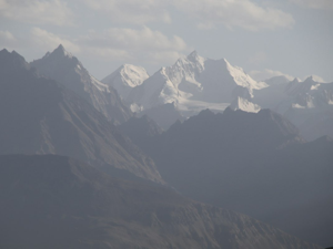 A few kilometres west of Khargush we stopped where a red, white and green concrete marker was set back from the Panj River to mark Tajik territory to Afghans on the other side of the river. There was a flurry of activity there as two small boys brought a large herd of goats to graze on the grass in the narrow floodplain of the river. Our last stop for the day was beside the road where we were able to look down the Wakhan Valley and see part of the Hindu Kush, the mountain range that separates Afghanistan from Pakistan (which was on the other side of the ridge we could see).