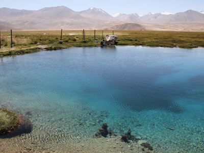 At a little after 11:00am, we stopped at a yak breeder’s house. This was no ‘tourist special’ – such things don’t exist in this remote eastern part of Tajikistan. When we arrived, the farmer’s wife was drawing water from a crystal-clear lake in an anabranch of the Alitchur River, a small braided stream that drains into Lake Yashi-kul to the west. The water was so clear that it was easy to see the schools of fish swimming in it. A few minutes’ walk brought us the farmhouse, near the pace on the banks of the stream where the farmer was tending two baby yak calves while the herd of adult yaks grazed on the lush grass of the river bed.