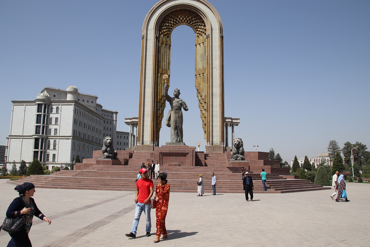 It was only a short drive from Victory park into the centre of Dushanbe. We stopped at Shahidan Square opposite the Majils, or Parliament House, to begin a walk through Central Park in the now bright sunshine. We were greeted by a somewhat ostentatious statue of Ismoli Somoni, an emir who lived around 900AD and is regarded by many in post-Soviet Tajikistan as the founder of the Tajik nation. His statue, framed by a golden arch, replaced an earlier, smaller and unarched statue of Vladimir Lenin in 1999. Until that time, Lenin’s statue had overlooked what had been called Lenin Prospekt during Soviet times.