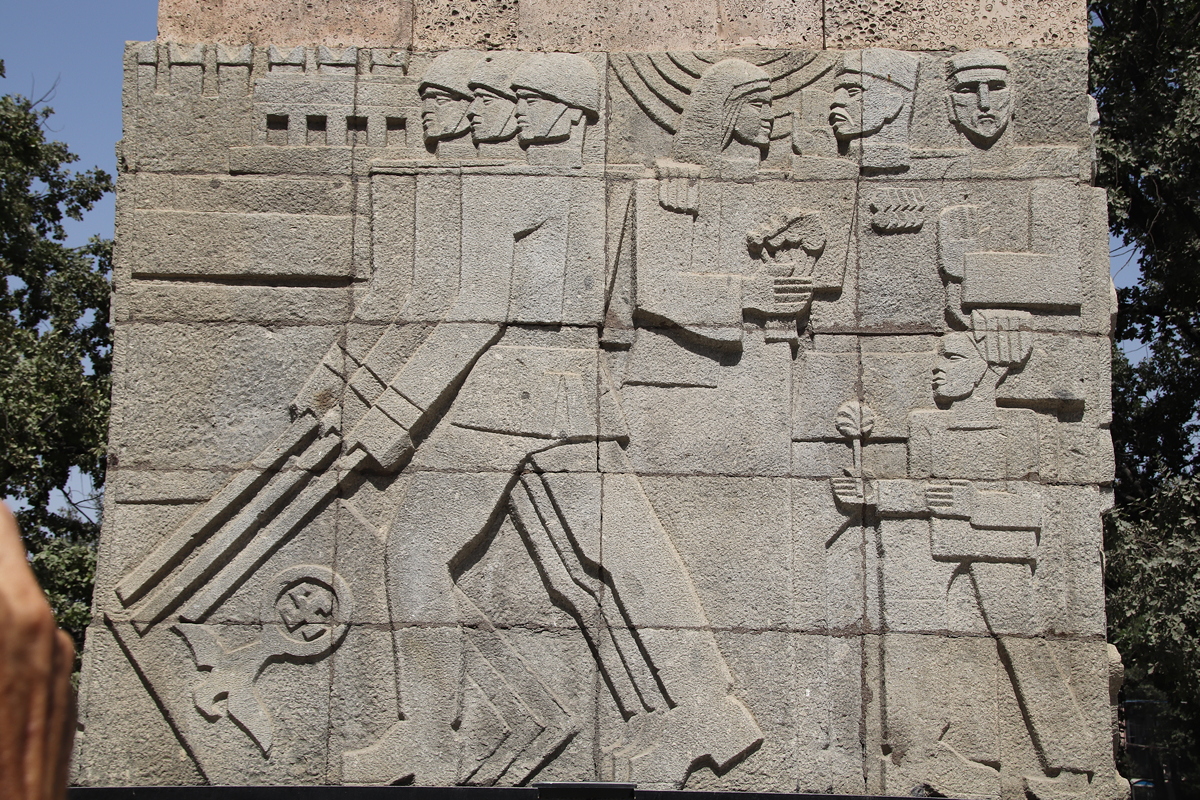 Our final stop before lunch was at the Victory Monument, located in a large traffic island called Aini Square. This Soviet-era monument to the Great Patriotic War (1941-1945) featured some interesting friezes of Soviet soldiers smashing Nazi swastikas and a beautifully preserved World War II Soviet T-34 tank.