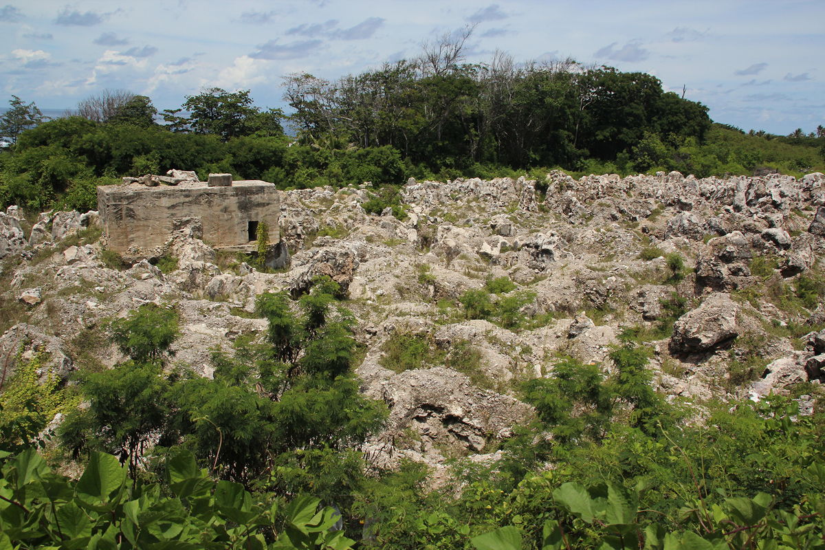 Our final stop with the NPC was towards the south-east of the island, very close to my hotel. Standing incongruously in the middle of a small area of abandoned phosphate mining was the stark cubic outline of a concrete bunker. It had been constructed as an underground medical centre by the Japanese during World War II, and was subsequently forgotten until phosphate mining excavated the structure. Mining in this area ceased shortly afterwards when locals became convinced that spirits of the dead had been released.