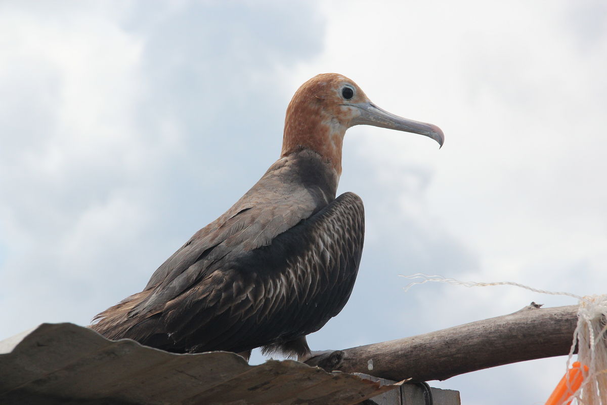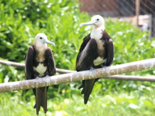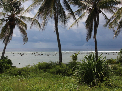 We continued our clockwise drive by proceeding northwards along Nauru’s west coast, through small villages of ribbon development comprising run-down (and often abandoned) houses and small shops, occasionally punctuated by primary schools. Given Nauru’s small size, it didn’t take very long to reach the northern coast, where we made one stop to see a place where frigate birds are being bred. These large, majestic, black and white, fish-eating birds are native to Nauru (and presumably also to other Pacific islands), and seeing them brought back mental images of old Nauruan postage stamps that featured frigate birds in flight. Some of the frigate birds were in large cages, but many others were free, perching on the roofs of buildings or on some T-bar posts that had been erected out to sea on the coral reef.