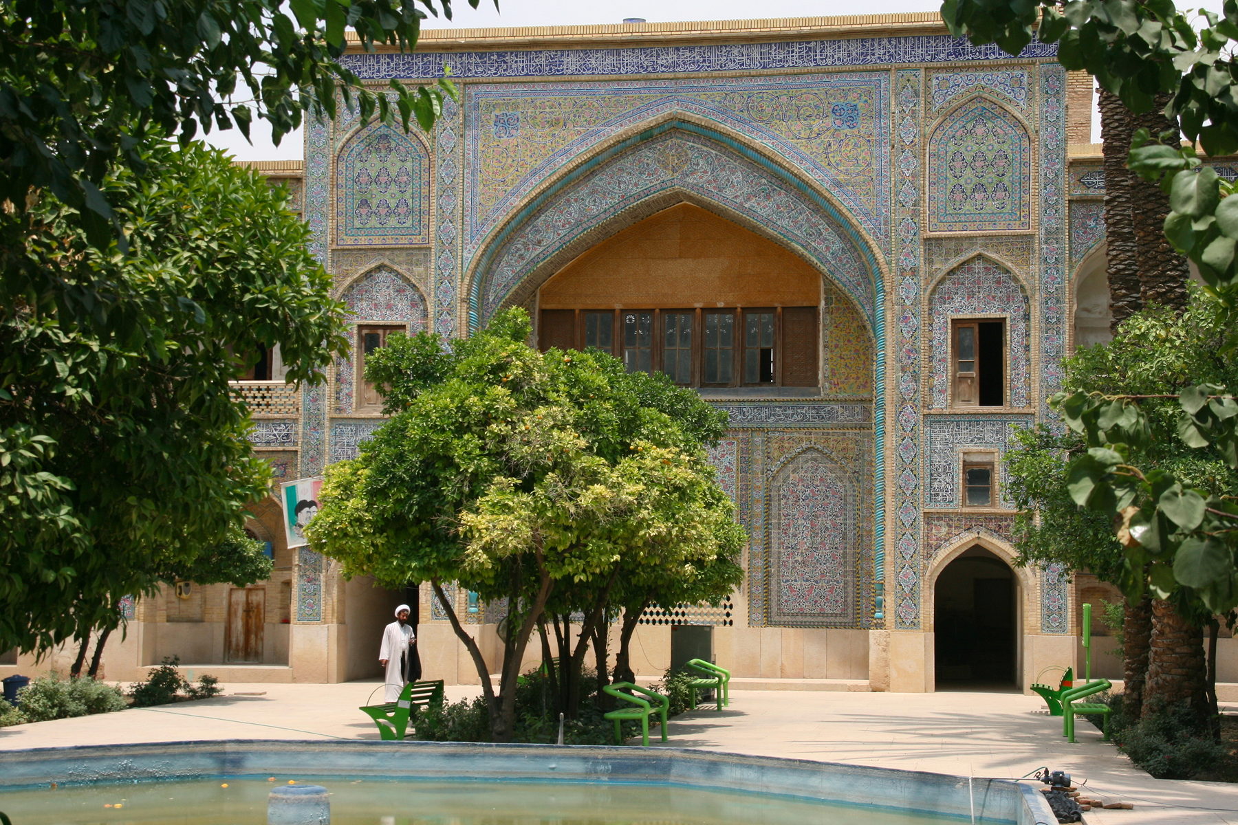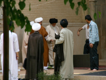 Our sixth stop was also a place that we were surprised, and pleased, to be able to enter.  This was the Khan Madrasah, a Koranic college for the training of mullahs that you may know better as Madraseh-ye Khan.  Built in a similar style to the large madrasahs in Samarkand and Bukhara (in Uzbekistan), we arrived just as the Grand Mullah was finishing a lecture to a small group of mullahs and trainees.  The madrasah was designed as a two-storey high open box surrounding a courtyard with tastefully landscaped pools and trees, the buildings being covered by beautifully intricate patterns of ceramic tiles.