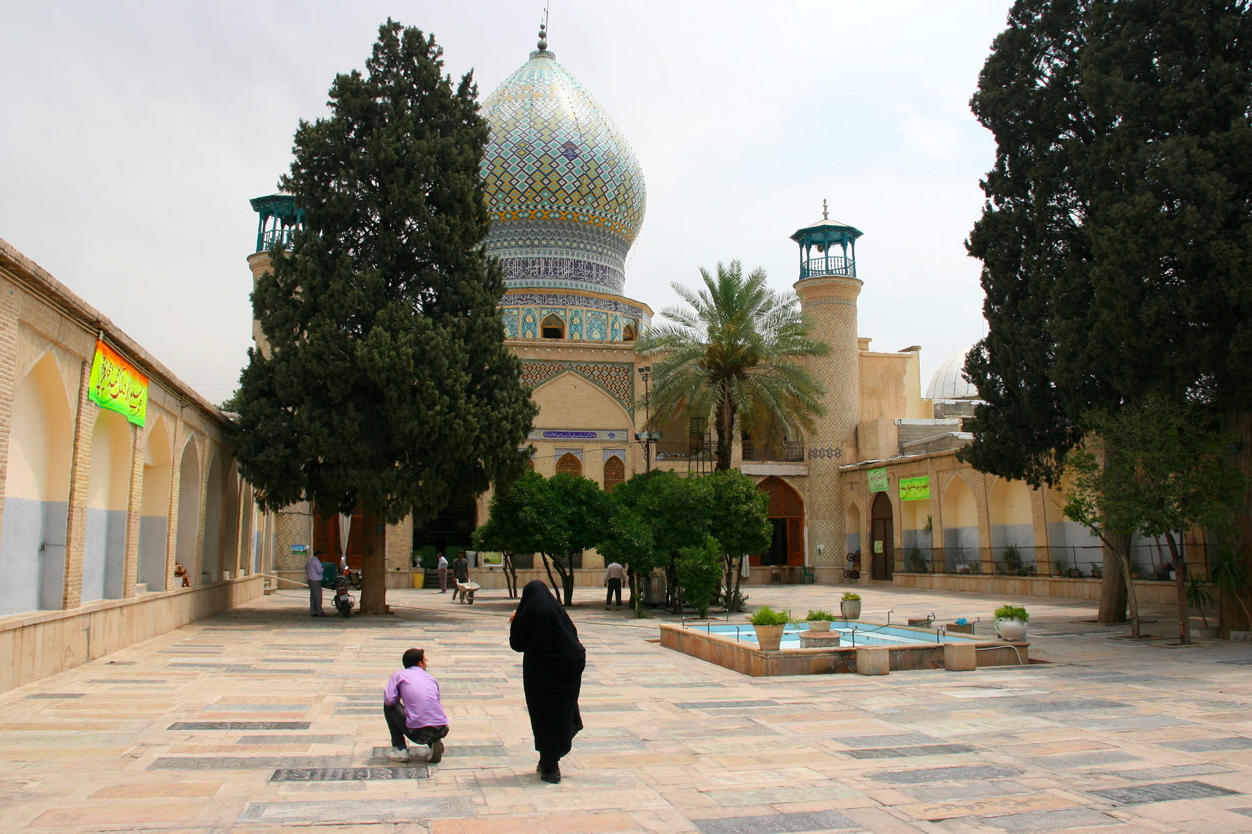 Our fifth stop (of ten) for the day was the Shrine of Ali-ben Hamza (which you may know better as the Imamzadeh-ye Ali Ebn-e Hamze).  Its exterior was dominated by an intricately decorated, bulbous Shirazi dome, but what made this shrine especially appealing  was that it welcomed non-Muslims inside, something that is very rare in Iran.  And so it was that Tim and I removed our shoes and entered inside, thus experiencing the dazzling mirror work on the walls and ceilings that are (we were told) typical of the interiors of most Iranian shrines.  It was wonderful to be welcomed so warmly into a place that is usually forbidden to outsiders so we could experience this architectural gem.