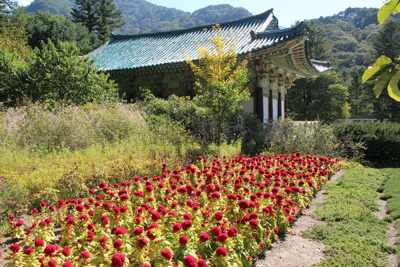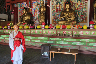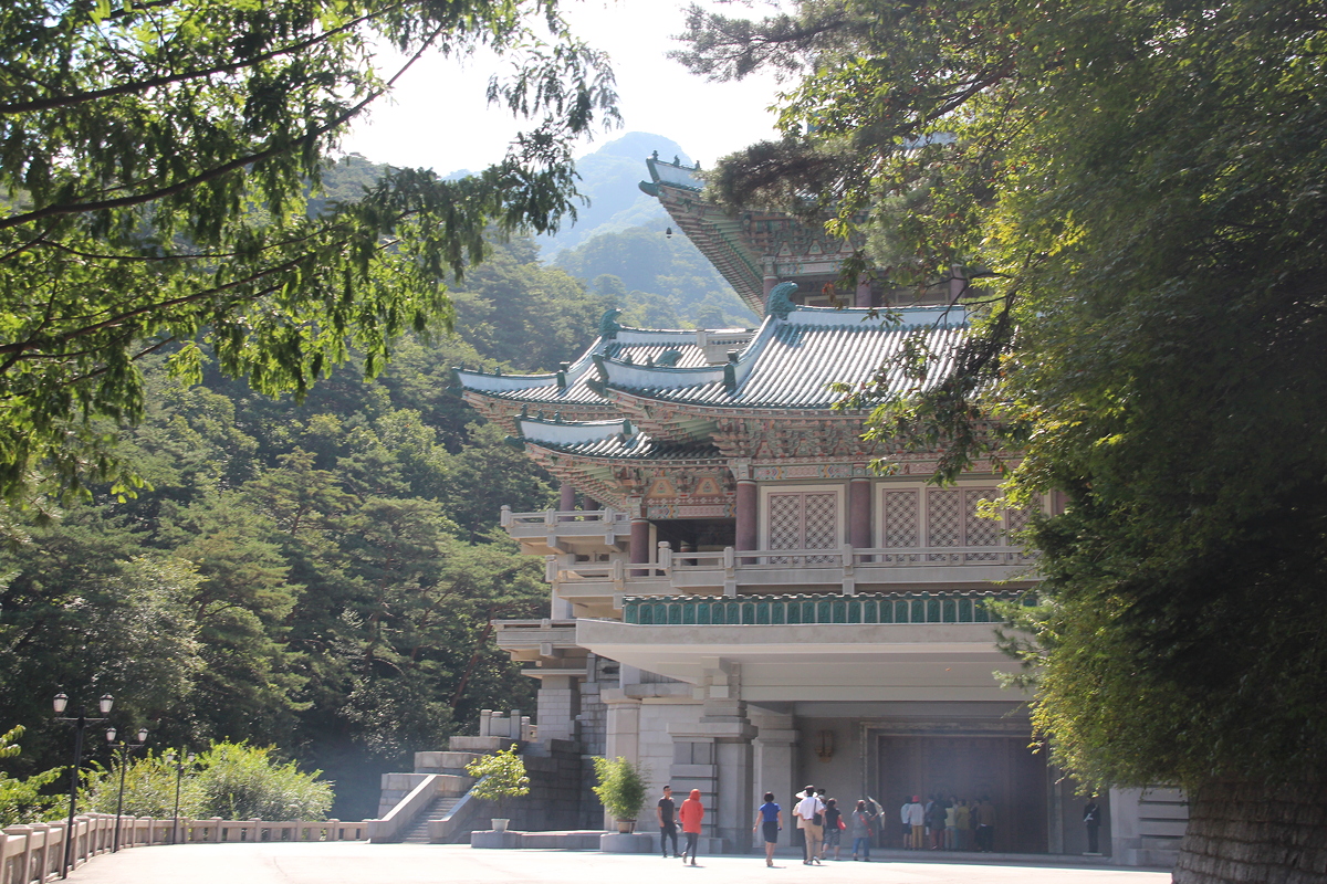 We had spent more than two and a half hours exploring the International Friendship Exhibition, so it was not possible to see the largely similar but less spectacular Hall B as well. We therefore drove the short distance to our other stop in Mount Myohyang, the Pohyon Buddhist Temple. First built during the Koryo Dynasty in 1042, the temple originally had 30 buildings, but 14 of these were destroyed by US bombing during the Korean War, together with some 10,000 religious relics. Many of the buildings have now been restored, and the temple complex and grounds are now one of the most beautiful places in all Korea. During our visit we were able to explore several of the buildings and meet the presiding monk, a gentle man who had done his theological training at Kim Il Sung University in Pyongyang.