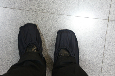 When we entered Hall A, we had to deposit our cameras and mobile phones at a cloak room after having left all bags back in the bus. The next step was the cover our shoes with elasticised shoe covers, presumably so the shine on the marble floors would not be diminished by scuff marks from the soles of our shoes.